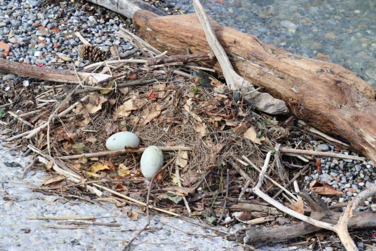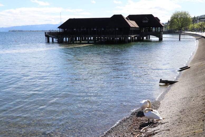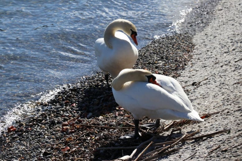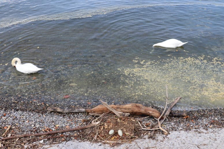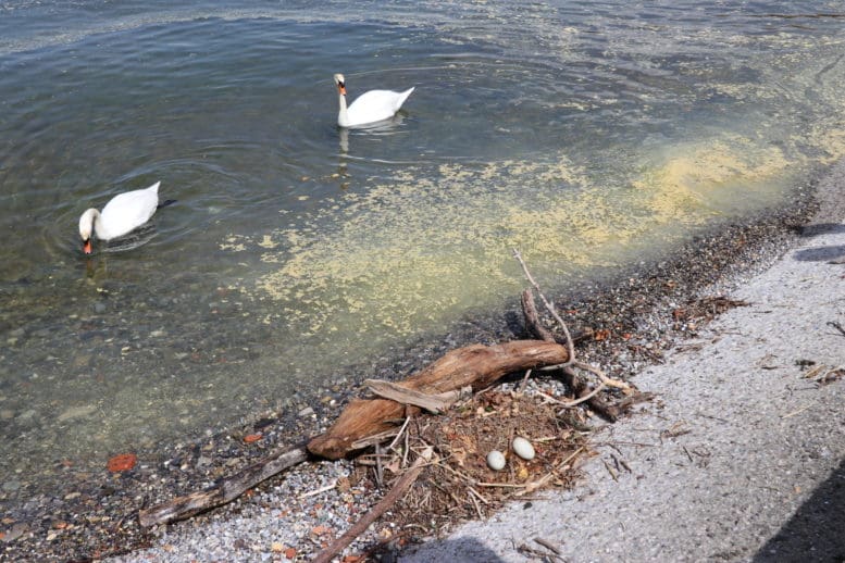 Am Sonntag war das Nest mit 2 Eiern noch da (Bilder unten), heute Morgen war davon nichts mehr zu sehen. Schwer abzuschätzen, ob da die Sturmböen und der dadurch vielleicht etwas aufgewühlte Bodensee der letzten Nacht wirkten oder ob anderen Umstände dafür verantwortlich waren. Für einmal also kein Schwanen-Happyend am Arion.
