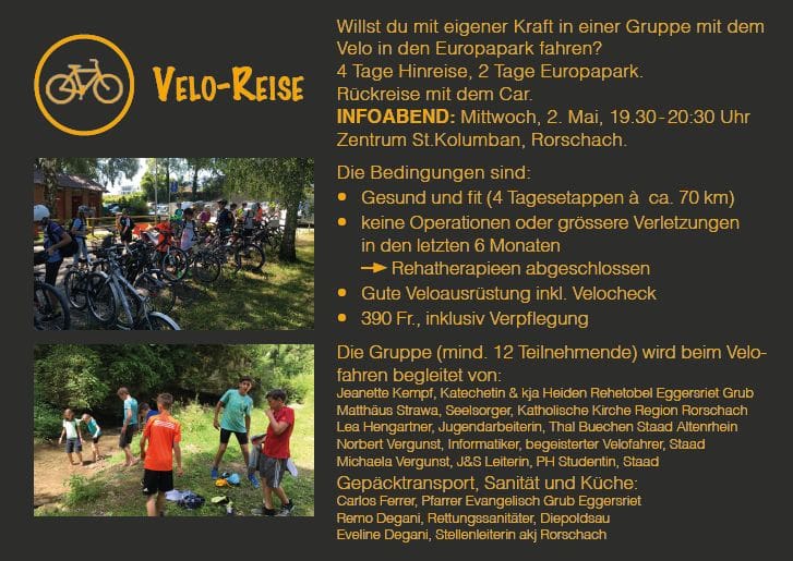 Wer im Sommer mit eigener Kraft in einer Gruppe von Rorschach nach Rust in den Europapark fahren will, kann sich morgen ab 19.30 Uhr im Zentrum St. Kolumban die dafür nötigen Informationen holen. Details findet man auch hier.
