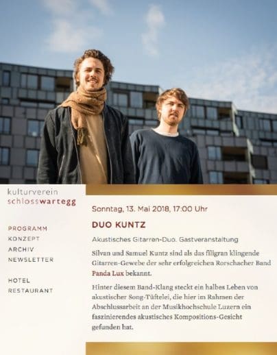 Silvan und Samuel Kuntz braucht man in der Region nicht mehr gross vorzustellen. Als Mitglieder von Panda Lux haben sich die beiden Rorschacher zusammen mit Moritz Widrig und Janos Mijnssen bereits einen Namen in der Schweizer Musikszene gemacht. Am nächsten Sonntag sind sie als akustisches Gitarren-Duo unterwegs und ab 17 Uhr im Schloss Wartegg zu hören.