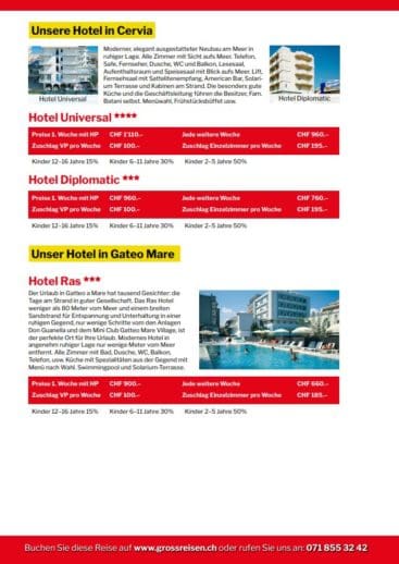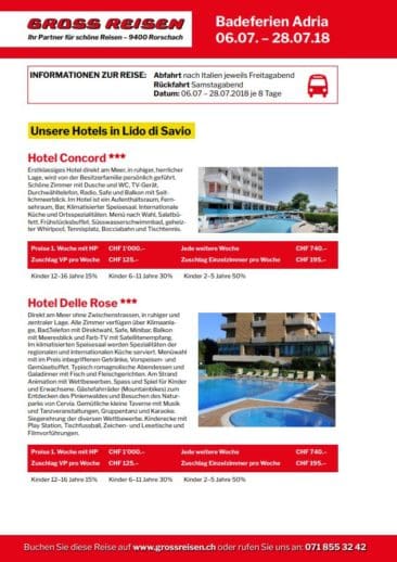 Badeferien an der Adria einfach und sorglos geniessenThemen:Gross ReisenPartnerRorschach 15. Mai 2018 - 16:37Gross Reisen Rorschach hat das – nebst vielen anderen Reisezielen auch – in seinem Angebot. Gross Reisen ist Rorschacher Echo-Partner.Teilen mit: Einen Link per E-Mail an einen Freund senden (Wird in neuem Fenster geöffnet) E-Mail Drucken (Wird in neuem Fenster geöffnet) Drucken Auf Facebook teilen (Wird in neuem Fenster geöffnet) Facebook Auf X teilen (Wird in neuem Fenster geöffnet) X Auf WhatsApp teilen (Wird in neuem Fenster geöffnet) WhatsApp Gefällt mir:Gefällt mir Wird geladen …Newsletter abonnieren Bitte dieses Feld leer lassenBitte wähle, ob Du über jeden neuen Beitrag sofort oder lieber jeden Morgen gegen 9 Uhr eine Zusammenfassung der neusten Beiträge erhalten möchtest.Liste(n) auswählen: Neues vom Echo (Zusammenfassung) Neues vom Echo (Sofortbenachrichtigung) Dieses Feld wird benötigt.Prüfen Sie Ihren Posteingang und den Spamordner, um Ihr Abonnement zu bestätigen.