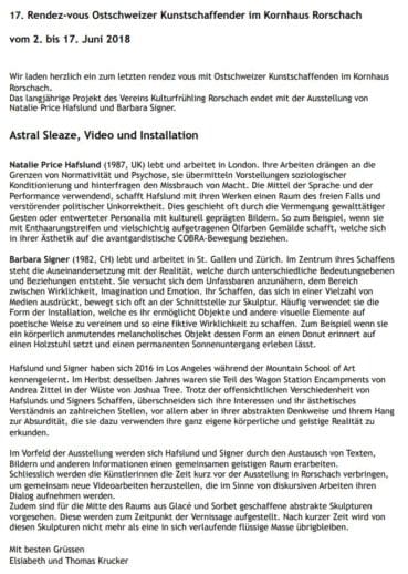 Signer und Hafslund begeben sich auf eine unbestimmte, quasisurrealistische Erkundungsreise, welche mit den Mitteln von Video und Skulptur die Grenzen zwischen dem selbst und dem anderen abtasten und die Trennlinien von Körper und Geist auflösen möchte. Mit Hilfe paranormaler Körperlichkeit und sprachlicher Darstellungen wollen die Künstlerinnen Gefäße schaffen, mit denen es möglich ist, ihre Erkenntnisse erfahrbar zu machen. Mehr Infos findet man auf der Homepage.