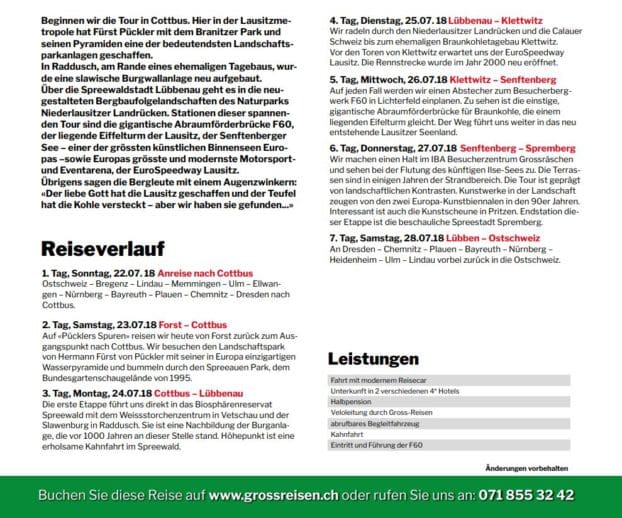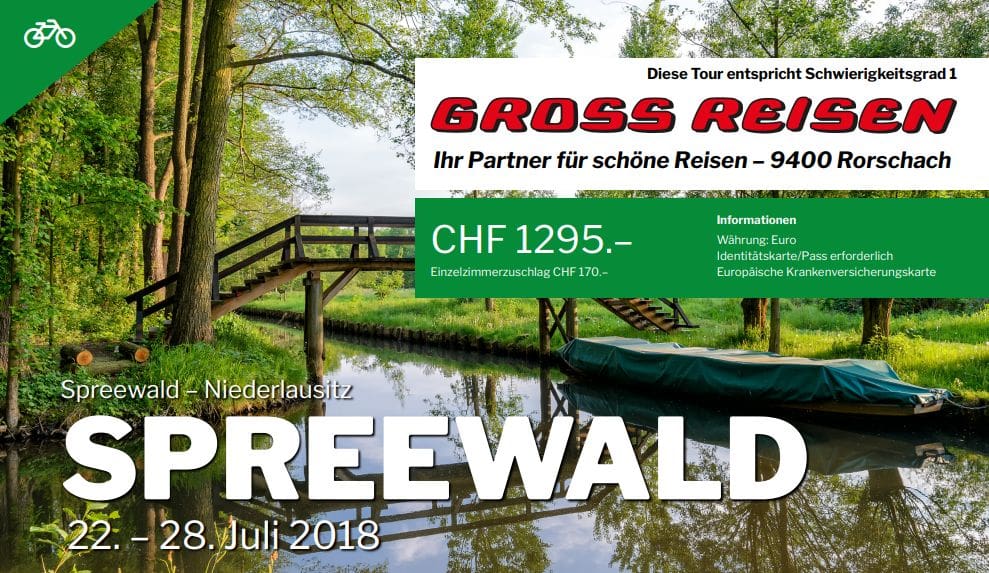 Das UNESCO Biosphärenreservat Spreewald ist eine einzigartige Kultur- und Naturlandschaft, die mit zahlreichen Wander- und Radwegen einen zusätzlichen Reiz erhält. Wer da nicht für einmal echt abschalten kann, macht etwas falsch. Und das Schönste daran: Gross Reisen fährt hin! Und auch andere Destinationen locken! Ein Blick auf die Webseite lohnt sich immer.
