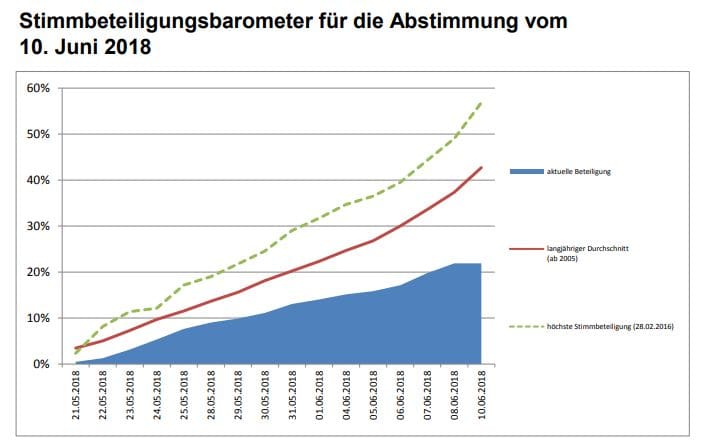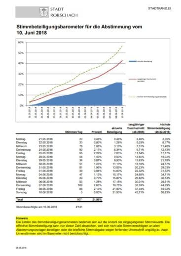 Schon fast dramatisch tiefe Stimmbeteiligung …Themen:Rorschach 9. Juni 2018 - 06:10Abstimmen kann man über die nationalen und kantonalen Vorlagen noch bis am Sonntagmittag. Die Urnen werden um 12 Uhr geschlossen.Teilen mit: Einen Link per E-Mail an einen Freund senden (Wird in neuem Fenster geöffnet) E-Mail Drucken (Wird in neuem Fenster geöffnet) Drucken Auf Facebook teilen (Wird in neuem Fenster geöffnet) Facebook Auf X teilen (Wird in neuem Fenster geöffnet) X Auf WhatsApp teilen (Wird in neuem Fenster geöffnet) WhatsApp Gefällt mir:Gefällt mir Wird geladen …Newsletter abonnieren Bitte dieses Feld leer lassenBitte wähle, ob Du über jeden neuen Beitrag sofort oder lieber jeden Morgen gegen 9 Uhr eine Zusammenfassung der neusten Beiträge erhalten möchtest.Liste(n) auswählen: Neues vom Echo (Zusammenfassung) Neues vom Echo (Sofortbenachrichtigung) Dieses Feld wird benötigt.Prüfen Sie Ihren Posteingang und den Spamordner, um Ihr Abonnement zu bestätigen.