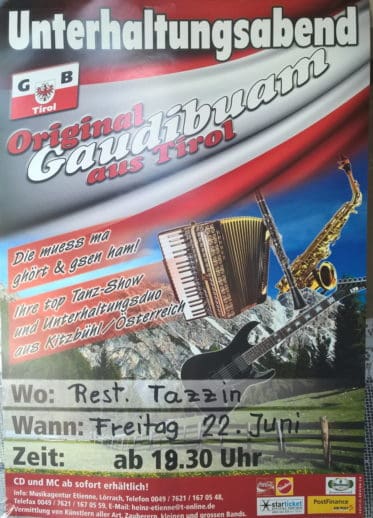 Morgen viel Unterhaltung im Restaurant TazzinThemen:BeizenKulturRorschacherberg 21. Juni 2018 - 05:17Monika Volmar und ihr Team haben die Original Gaudibuam aus Tirol ins Tazzin geholt. Start ist um 18.30 Uhr. Viel Spass.Teilen mit: Einen Link per E-Mail an einen Freund senden (Wird in neuem Fenster geöffnet) E-Mail Drucken (Wird in neuem Fenster geöffnet) Drucken Auf Facebook teilen (Wird in neuem Fenster geöffnet) Facebook Auf X teilen (Wird in neuem Fenster geöffnet) X Auf WhatsApp teilen (Wird in neuem Fenster geöffnet) WhatsApp Gefällt mir:Gefällt mir Wird geladen …Newsletter abonnieren Bitte dieses Feld leer lassenBitte wähle, ob Du über jeden neuen Beitrag sofort oder lieber jeden Morgen gegen 9 Uhr eine Zusammenfassung der neusten Beiträge erhalten möchtest.Liste(n) auswählen: Neues vom Echo (Zusammenfassung) Neues vom Echo (Sofortbenachrichtigung) Dieses Feld wird benötigt.Prüfen Sie Ihren Posteingang und den Spamordner, um Ihr Abonnement zu bestätigen.