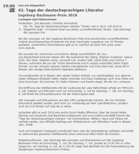 Anna Stern ist eigentlich Anna Bischofberger und ihr literarisches Talent ist selbst bei uns schon wahrgenommen worden. Und wenn sogar der Blick am Dienstag schreibt „Autorin Anna Stern gilt als eines der grössten literarischen Talente der Schweiz“, dann muss da wohl was dran sein. Die Sendung aus Klagenfurt wird heute ab 10 Uhr auf 3Sat live übertragen. Weitere Detailinfos erhält man auch hier.