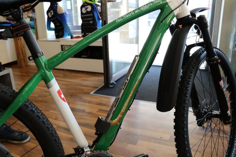 Wenn Esther Beerli mit ihrem geschulterten Alphorn die Mariabergstrasse herunter läuft und sich mit ihrem übergrossen Instrument in den kleinen Laden von Bischibikes zwängt, dann frägt man sich, ob sie dort zwischen den Velos und Bikes ein Konzert geben will. Soviel vorweg: Ein Konzert fand nicht statt, aber eine kleine Kostprobe ihres Könnens. Der Grund war ein viel einfacherer: Esther Beerli hat ihren „Alphorn-Blitz“ abgeholt. Und selbstverständlich darf auf diesem speziellen Bike auch das Alphorn nicht fehlen …