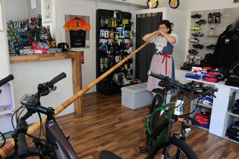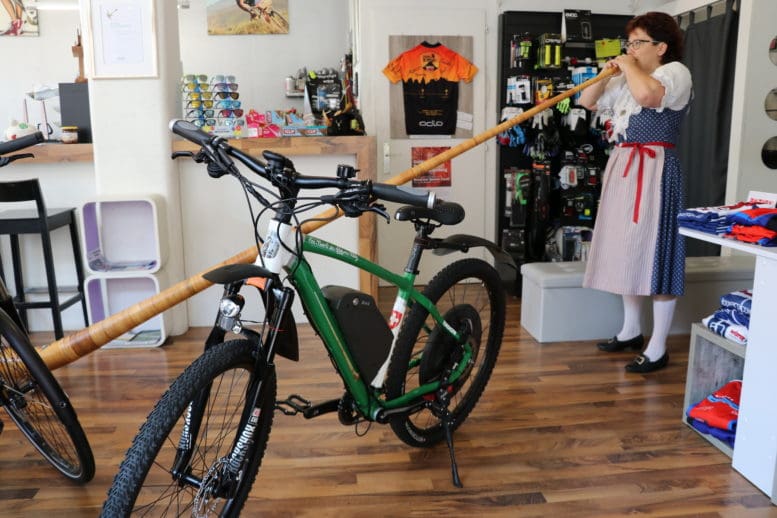 Wenn Esther Beerli mit ihrem geschulterten Alphorn die Mariabergstrasse herunter läuft und sich mit ihrem übergrossen Instrument in den kleinen Laden von Bischibikes zwängt, dann frägt man sich, ob sie dort zwischen den Velos und Bikes ein Konzert geben will. Soviel vorweg: Ein Konzert fand nicht statt, aber eine kleine Kostprobe ihres Könnens. Der Grund war ein viel einfacherer: Esther Beerli hat ihren „Alphorn-Blitz“ abgeholt. Und selbstverständlich darf auf diesem speziellen Bike auch das Alphorn nicht fehlen …