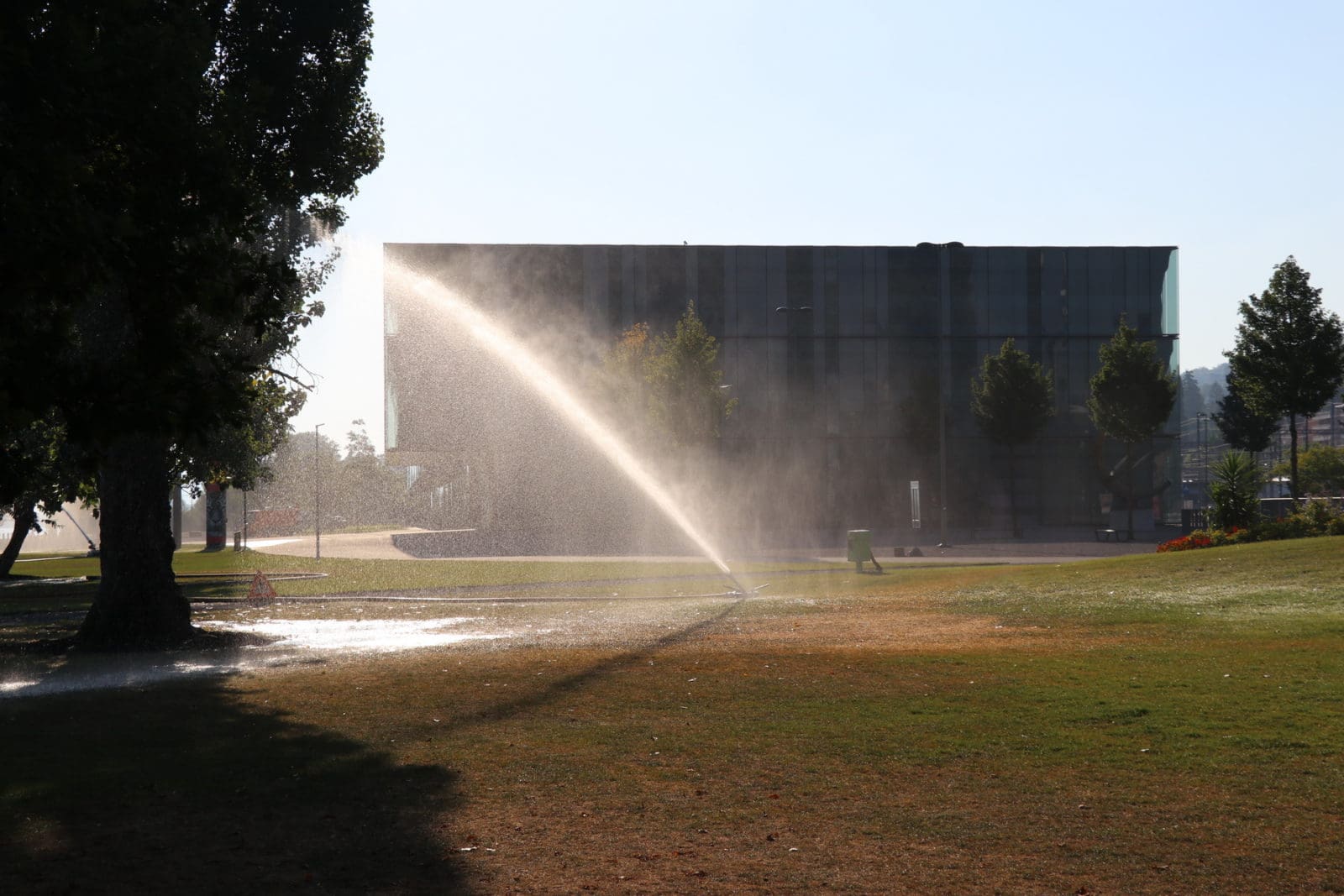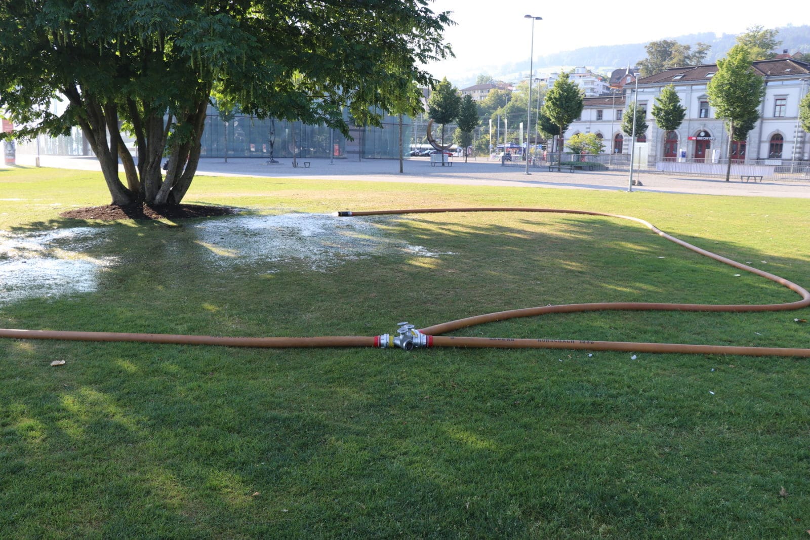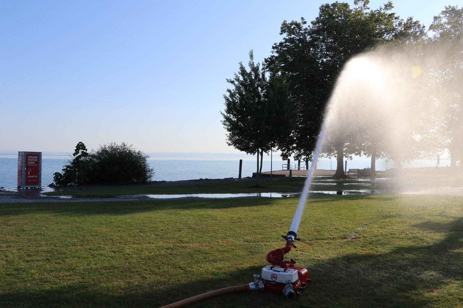 Im wahrsten Sinne des Wortes Hochsommer. Während viele von uns geniessen, ächzt die Natur. Die Bilder unten zeigen, wie die Rasenflächen heute Morgen eifrig genässt wurden. Das dafür benötigte Wasser stammt direkt aus dem Bodensee. Ohne diese Massnahme würde der Rasen schnell verdorren. Ich habe mich bereits in die kühle und verdunkelte Wohnung zurückgezogen. Next time draussen: Rorschach – da isch Musig. Ab 19 Uhr vor 6 Beizen in der Stadt.