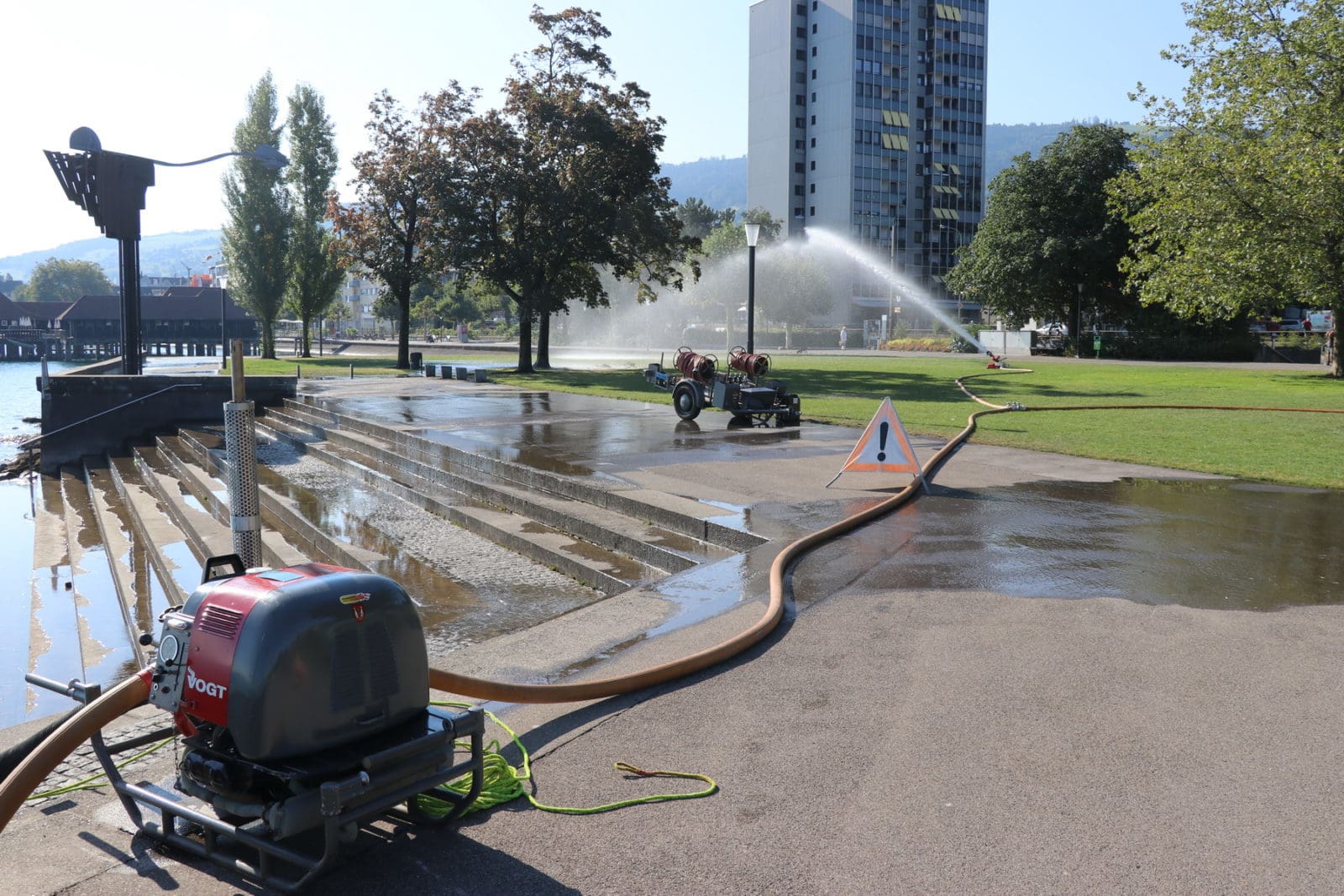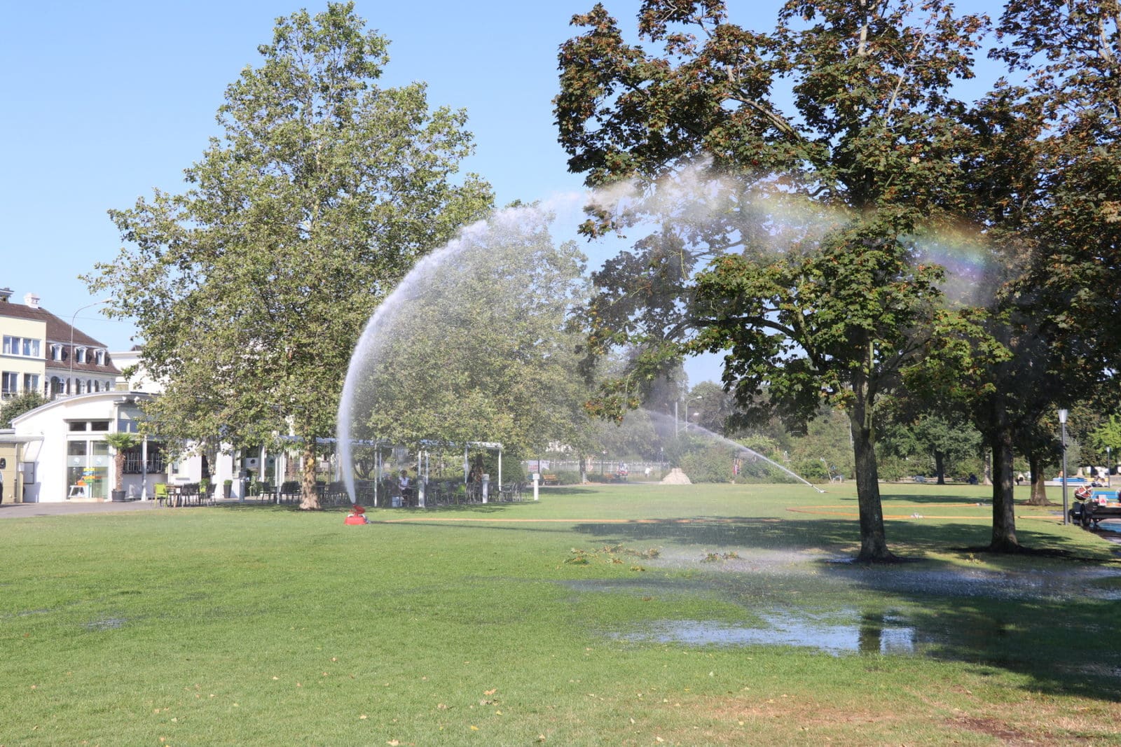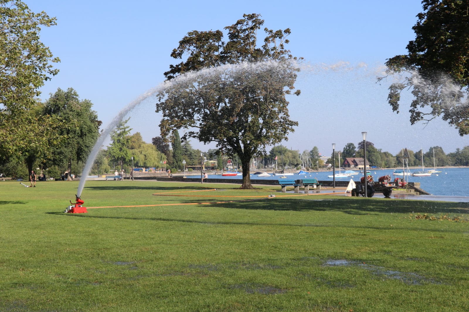 Hitze und Trockenheit halten an – und es ist kein Ende in Sicht. Für die grossen Rasenflächen an der Rorschacher Seepromenade ist das Bewässern unumgänglich. Das Wasser wird auch hier direkt aus dem Bodensee gepumpt. Heute Bilder von der Arionwiese, geschossen um ca. 9 Uhr.