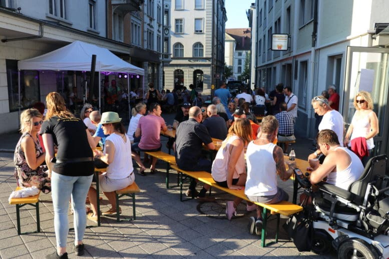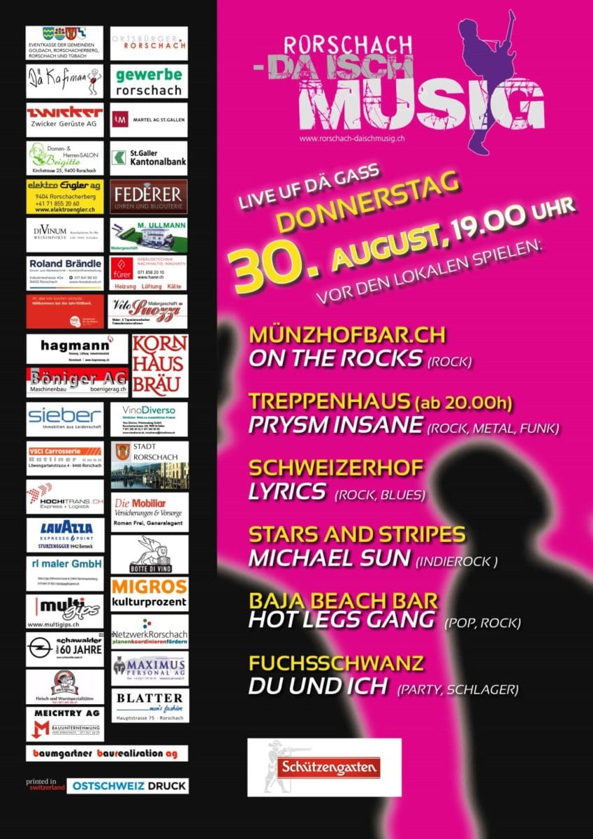 Gestern belebten 6 Livekonzerte vor 6 Beizen die Rorschacher Gassen. Am Anfang war es fast noch zu heiss, doch dann spielte das Wetter perfekt mit. Und als es so richtig lauschig wurde war es auch bereits wieder 22 Uhr. Hier einige Schnappschüsse von den Konzerten vor der Münzhofbar, beim Stars and Stripes, beim Fuchsschwanz (Beitragsbild oben), vor dem Treppenhaus und auf der Schweizerhof-Terrasse. Ein wunderbarer Abend. Ein Dankeschön an alle, die da mitmachen und so einen fetzigen Anlass ermöglichen.