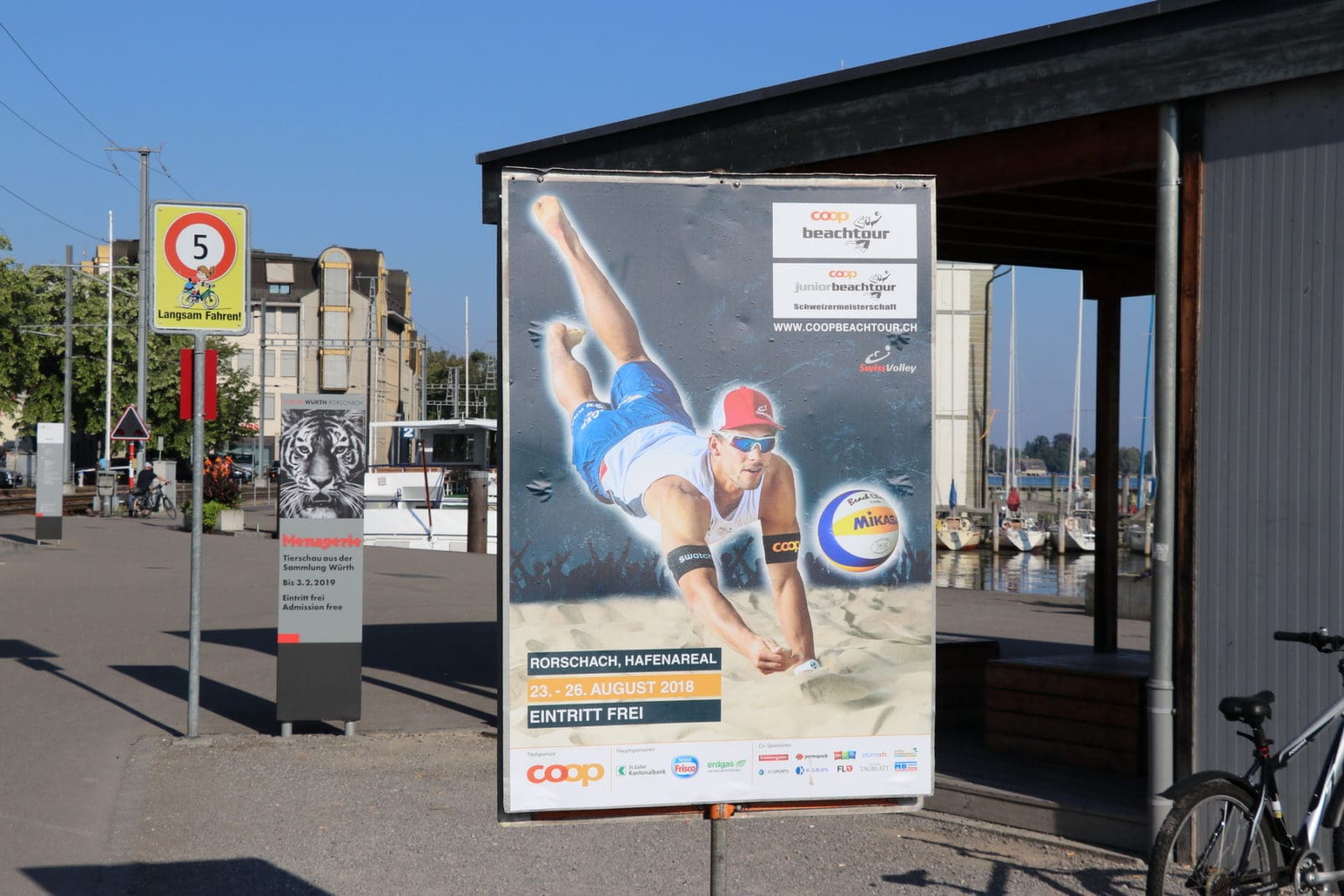 Sie sind auf dem Stadtgebiet nicht zu übersehen – die Hinweisplakate für die kommende Coopbeachtour. Noch bis morgen gastiert die Tour in Basel und dann heisst es bereits: Next Stopp Rorschach. Bei uns auf dem Kabisplatz wird der Grossanlass dann vom 23. bis 26. August durchgeführt.