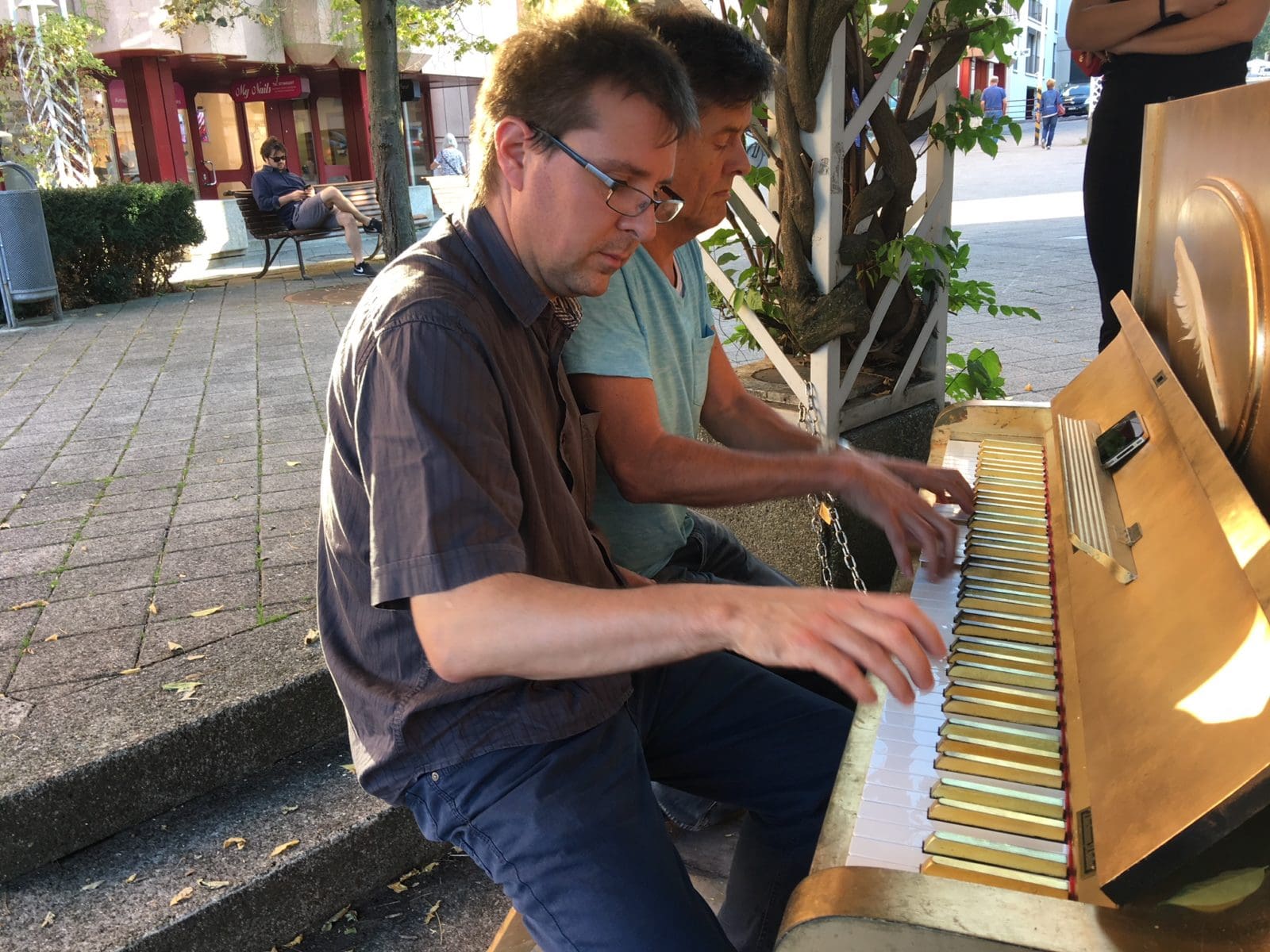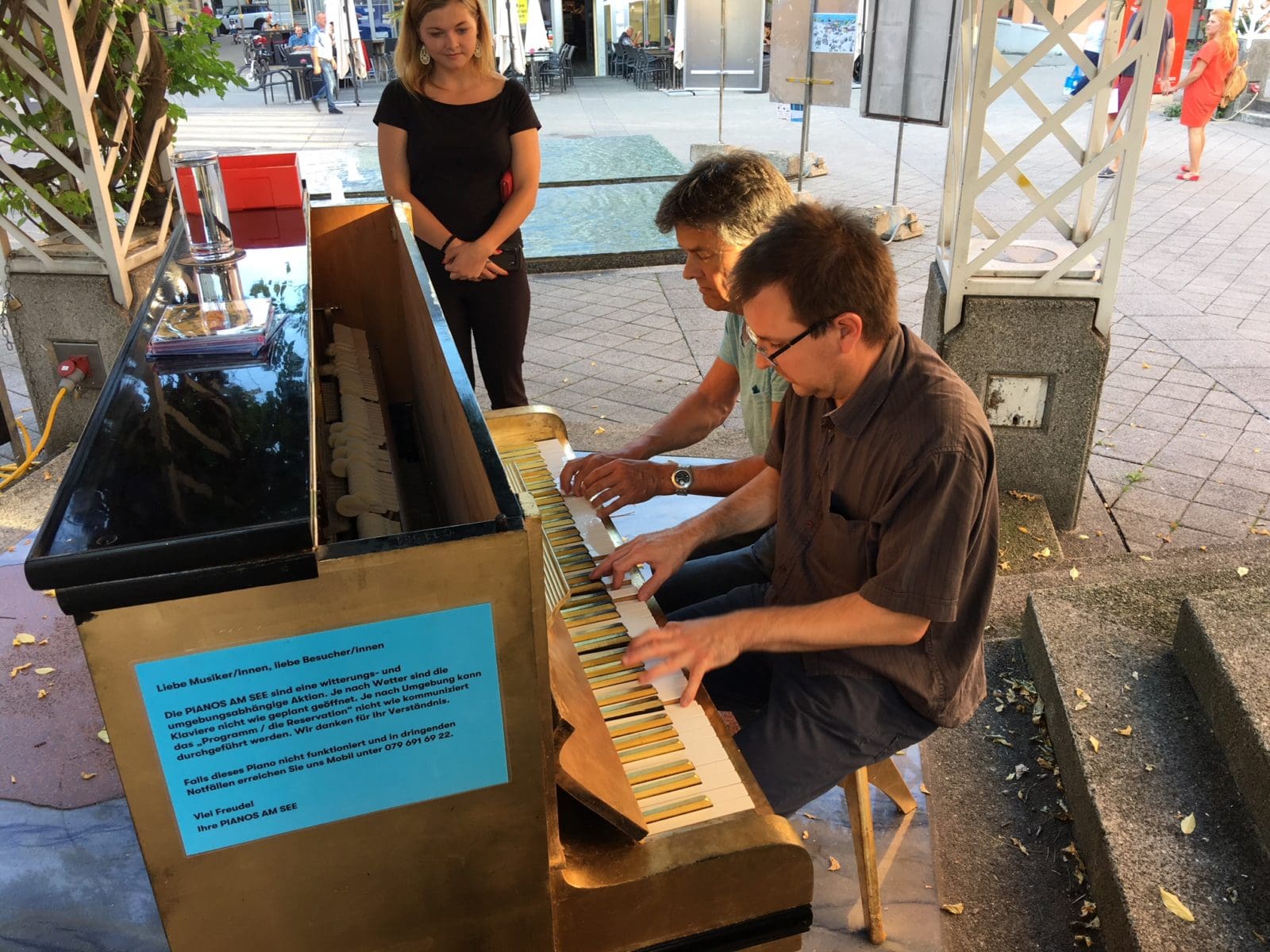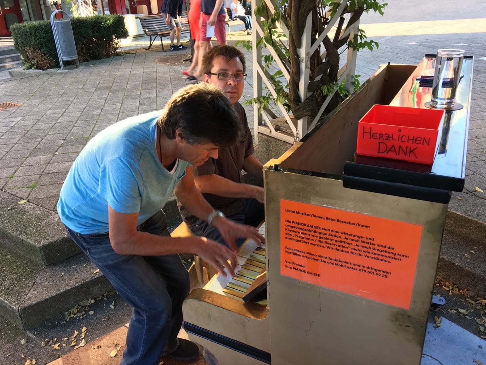Der Corale Santa Cecilia wird heute sein Probelokal verlegen. Er nutzt das Projekt „Pianos am See“ auf dem Marktplatz und wird dort zwischen 19 und 20 Uhr die Innenstadt für eine Stunde mit italienischem Flair verzaubern. Unten noch Bilder und ein Video vom Dienstagabend, als Eddy und Fritz den Marktplatz ordentlich aufmischten.