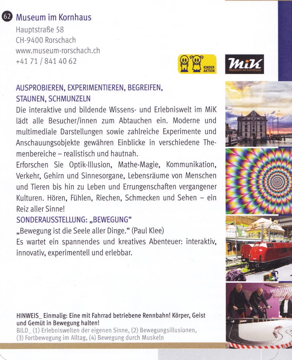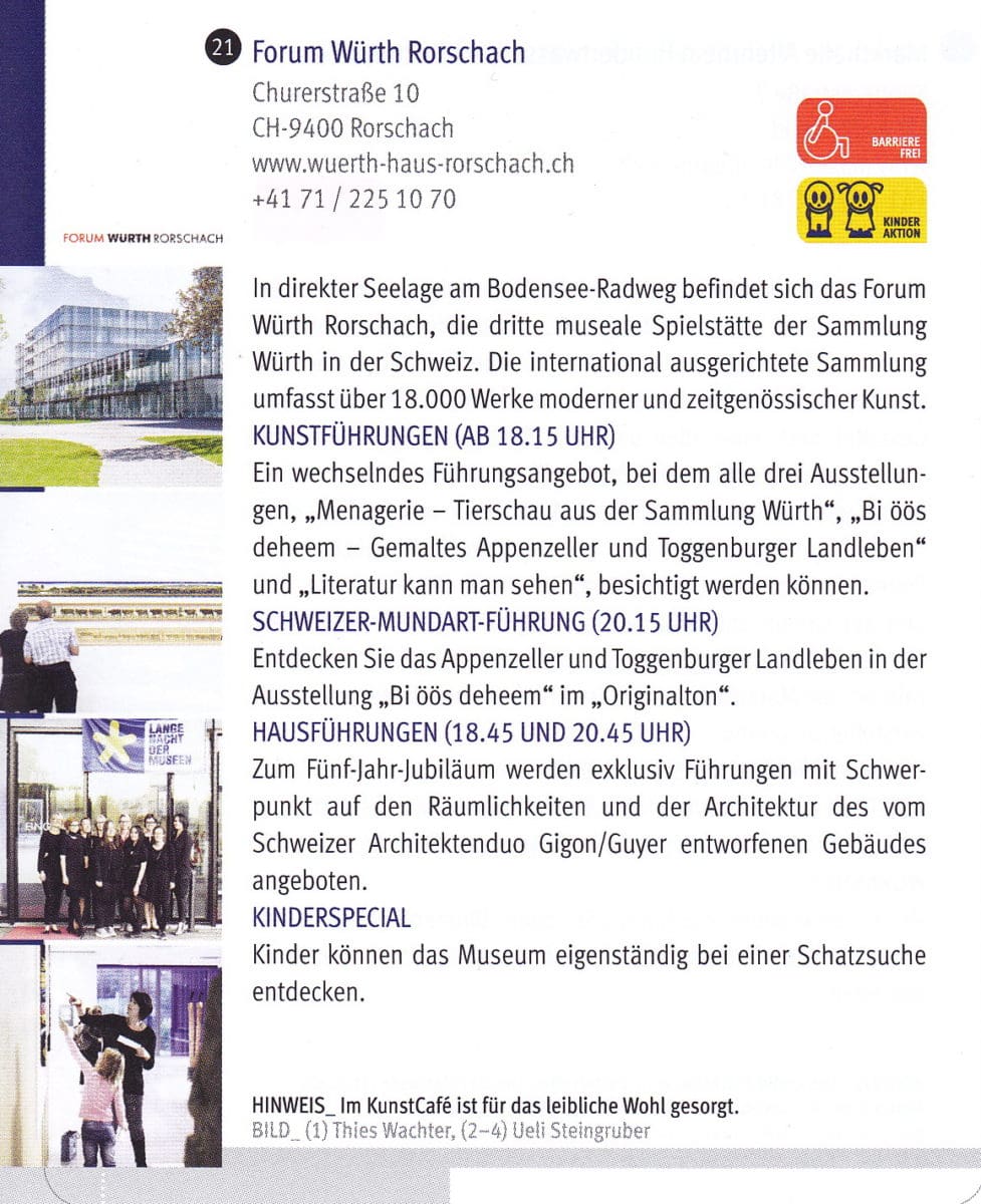 Am kommenden Samstag findet eine weitere „Lange Nacht der Museen“ statt. Bei uns in Rorschach machen da das Museum im Kornhaus sowie das Forum Würth Rorschach mit. Detailinformationen findet man auf den jeweiligen Homepagen oder den unten abgedruckten Flyern. Ideal für Kinder!!