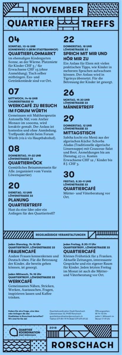 - Morgen Sonntag, 4. November 2018 findet von 10-16 Uhr der Quartier-Flohmarkt vom Verein Löwenquartier bereits zum 10. Mal statt! Aufgrund der kalten Temperaturen findet der Flohmarkt im ehemaligen Kindergarten Sonne am Sonnenweg 3 (beim Stadtbahnhof) – in der Wärme – statt.