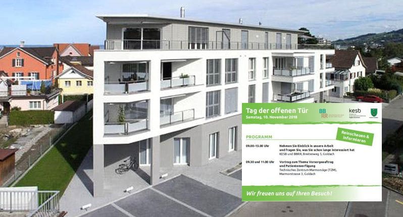 Die Kindes- und Erwachsenenschutzbehörden (KESB) im Kanton St. Gallen laden die Bevölkerung ein, die Tätigkeiten und Aufgaben der KESB kennenzulernen und mit den Mitarbeitenden in Kontakt zu treten. Dafür öffnen alle neun KESB im Kanton St. Gallen am Samstag, 10. November 2018, ihre Türen. Die KESB und die Berufsbeistandschaft Region Rorschach geben Einblick in den Berufsalltag und haben die Räumlichkeiten am Breitenweg 5 in Goldach durchgehend von 09.00 Uhr bis 13.00 Uhr geöffnet. Ein Vortrag zum Thema «Vorsorgeauftrag und Patientenverfügung» mit anschliessender Fragerunde kann um 09.30 Uhr oder um 11.00 Uhr im Theoriesaal Technisches Zentrum Marmorsäge (TZM), Marmorstrasse 3, 9403 Goldach, besucht werden.