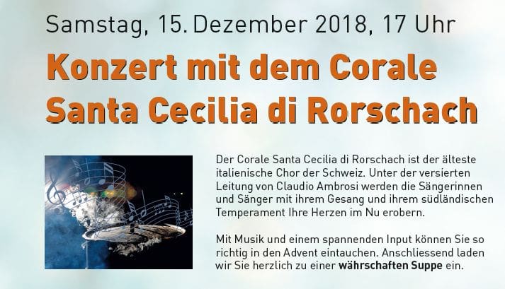 Corale Santa Cecilia – aber erst in einem MonatThemen:Anfrage für VeröffentlichungKulturRorschacherberg 15. November 2018 - 05:10Vormerken. Das Konzert findet aber erst am Samstag, 15. Dezember 2018, in der Kirche im Park in Rorschacherberg statt.Teilen mit: Einen Link per E-Mail an einen Freund senden (Wird in neuem Fenster geöffnet) E-Mail Drucken (Wird in neuem Fenster geöffnet) Drucken Auf Facebook teilen (Wird in neuem Fenster geöffnet) Facebook Auf X teilen (Wird in neuem Fenster geöffnet) X Auf WhatsApp teilen (Wird in neuem Fenster geöffnet) WhatsApp Gefällt mir:Gefällt mir Wird geladen …Newsletter abonnieren Bitte dieses Feld leer lassenBitte wähle, ob Du über jeden neuen Beitrag sofort oder lieber jeden Morgen gegen 9 Uhr eine Zusammenfassung der neusten Beiträge erhalten möchtest.Liste(n) auswählen: Neues vom Echo (Zusammenfassung) Neues vom Echo (Sofortbenachrichtigung) Dieses Feld wird benötigt.Prüfen Sie Ihren Posteingang und den Spamordner, um Ihr Abonnement zu bestätigen.