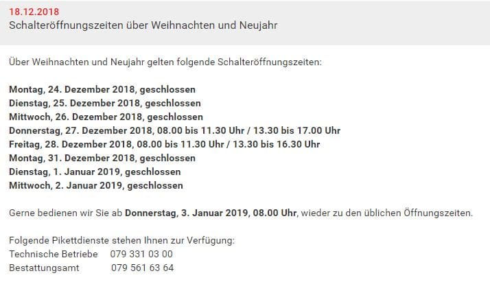Die Stadtverwaltung Rorschach hat die Schalteröffnungszeiten über die Festtage festgelegt. Ein Pikettdienst ist installiert. In der Hoffnung, dass man diese Dienste nicht braucht, hier trotzdem die entsprechenden Nummern: