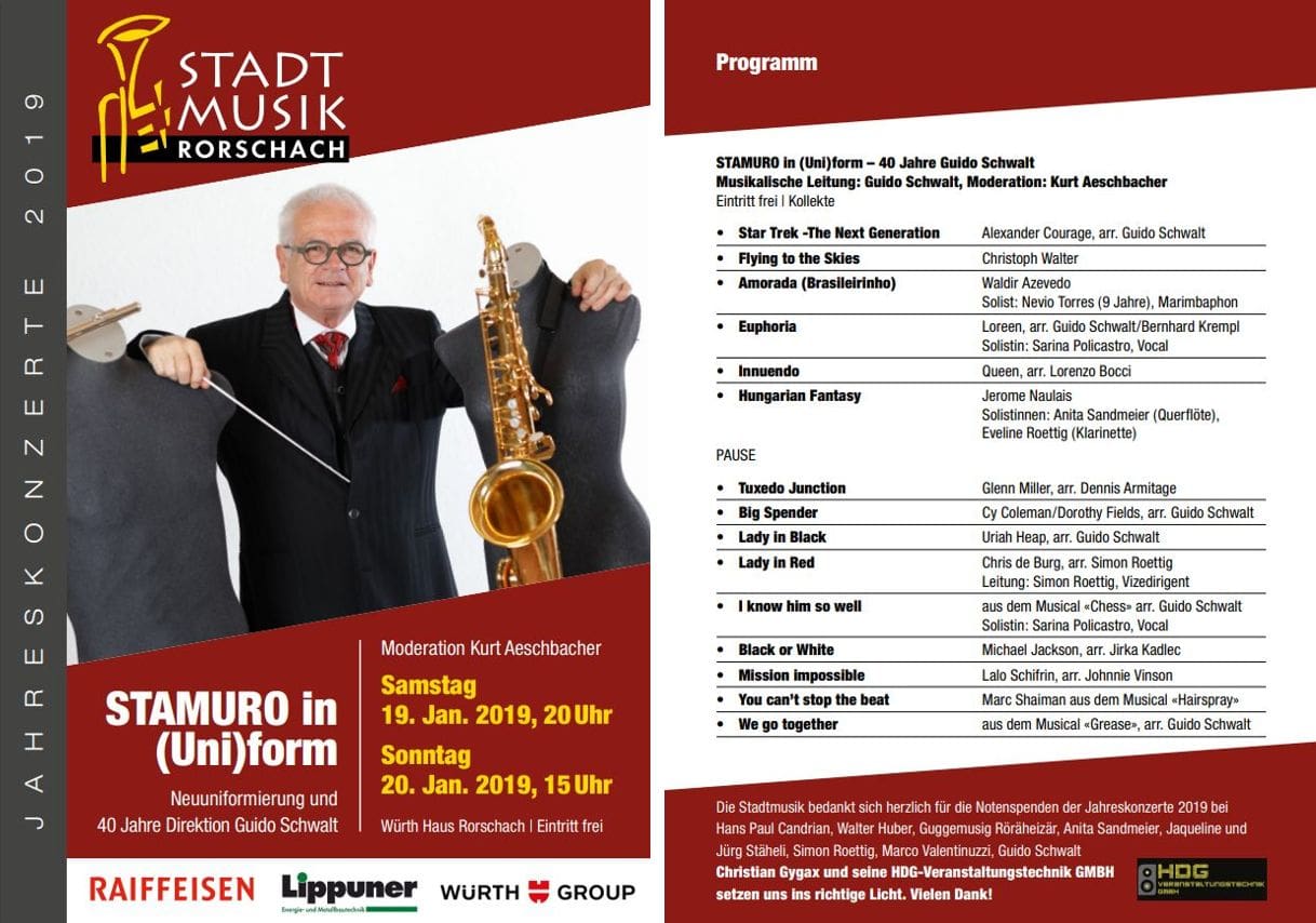 Vormerken: Jahreskonzerte der Stadtmusik RorschachThemen:KulturRorschachStadtmusikWürth 20. Dezember 2018 - 05:05Die beiden Konzerte der Stadtmusik Rorschach im Carmen Würth-Saal in Rorschach finden am 19. und 20. Januar 2019 statt. Details findet man hier. Teilen mit: Einen Link per E-Mail an einen Freund senden (Wird in neuem Fenster geöffnet) E-Mail Drucken (Wird in neuem Fenster geöffnet) Drucken Auf Facebook teilen (Wird in neuem Fenster geöffnet) Facebook Auf X teilen (Wird in neuem Fenster geöffnet) X Auf WhatsApp teilen (Wird in neuem Fenster geöffnet) WhatsApp Gefällt mir:Gefällt mir Wird geladen …Newsletter abonnieren Bitte dieses Feld leer lassenBitte wähle, ob Du über jeden neuen Beitrag sofort oder lieber jeden Morgen gegen 9 Uhr eine Zusammenfassung der neusten Beiträge erhalten möchtest.Liste(n) auswählen: Neues vom Echo (Zusammenfassung) Neues vom Echo (Sofortbenachrichtigung) Dieses Feld wird benötigt.Prüfen Sie Ihren Posteingang und den Spamordner, um Ihr Abonnement zu bestätigen.