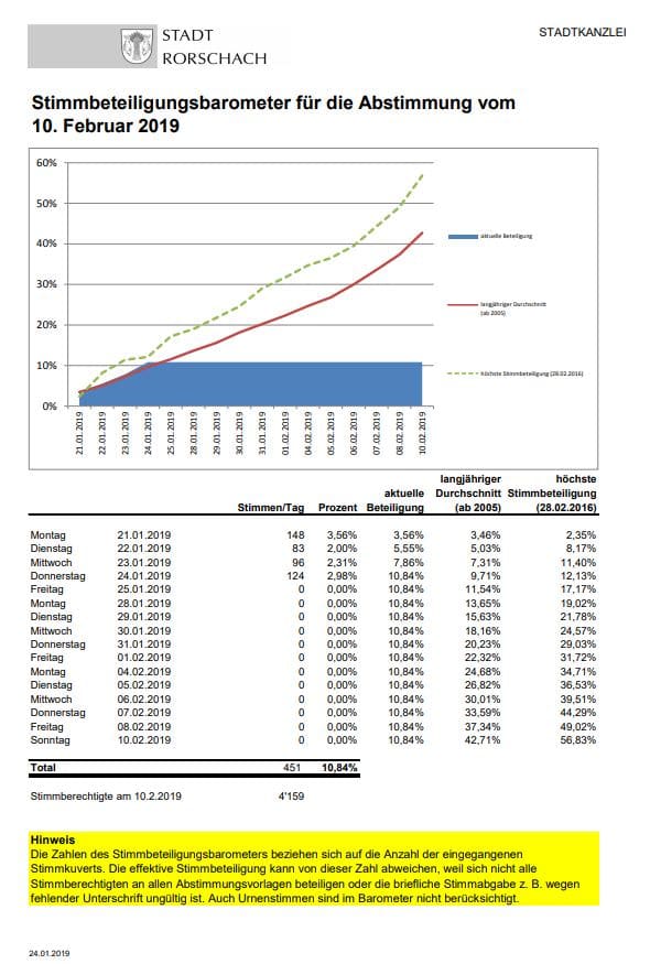 Für die Abstimmung vom 10. Februar haben bis gestern 10,84 % der stimmberechtigten RorschacherInnen ihre Unterlagen bereits abgegeben. Das Stimmbeteiligungsbarometer findet man auf der Homepage der Stadt Rorschach.