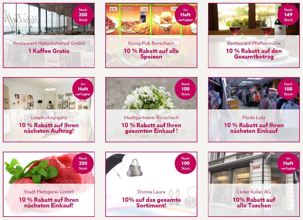 26 Gwerbler hat sich entschieden, beim Gutscheinheft von Couplys mitzumachen. Diese Idee wurde bereits in Amriswil und Romanshorn durchgeführt. Die entsprechenden Gutscheinhefte mit vielen Aktionen und Rabatten sollen in den nächsten Tagen aufliegen. Nachstehend jene Geschäfte aus Rorschach, die da mitmachen.