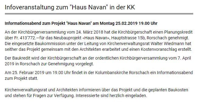 Der Kirchenverwaltungsrat und die Architekten informieren am Montag, 25. Februar 2019 ab 19 Uhr in der Kolumbanskirche zum Projekt „Haus Navan“. Das letzte Wort hat dann die Kirchbürgerschaft an der ordentlichen Kirchbürgerversammlung vom 7. April 2019.