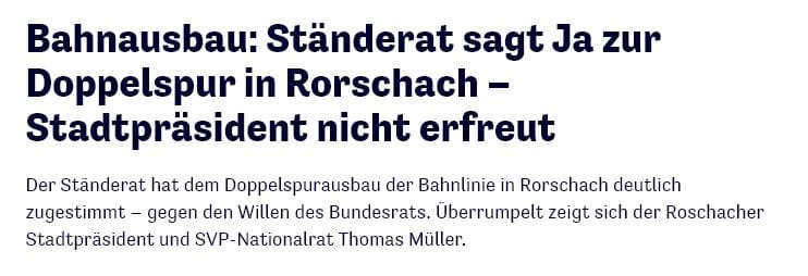 Der Ständerat hat dem Doppelspurausbau der Bahnlinie in Rorschach deutlich zugestimmt – gegen den Willen des Bundesrats. Überrumpelt zeigt sich der Rorschacher Stadtpräsident und SVP-Nationalrat Thomas Müller. Den ganzen Text auf Tagblatt Online findet man hier.