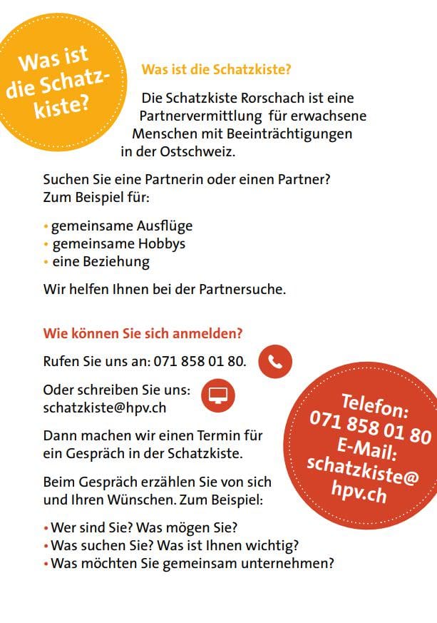 Die ganz besondere PartnervermittlungThemen:KulturRorschach 12. Mai 2019 - 06:18Ein wichtiges Thema, denn auch Menschen mit einer Beeinträchtigung sehnen sich nach Partnerschaft und Geborgenheit. Den Flyer findet man auch hier. Den Link zur Webseite hier.Teilen mit: Einen Link per E-Mail an einen Freund senden (Wird in neuem Fenster geöffnet) E-Mail Drucken (Wird in neuem Fenster geöffnet) Drucken Auf Facebook teilen (Wird in neuem Fenster geöffnet) Facebook Auf X teilen (Wird in neuem Fenster geöffnet) X Auf WhatsApp teilen (Wird in neuem Fenster geöffnet) WhatsApp Gefällt mir:Gefällt mir Wird geladen …Newsletter abonnieren Bitte dieses Feld leer lassenBitte wähle, ob Du über jeden neuen Beitrag sofort oder lieber jeden Morgen gegen 9 Uhr eine Zusammenfassung der neusten Beiträge erhalten möchtest.Liste(n) auswählen: Neues vom Echo (Zusammenfassung) Neues vom Echo (Sofortbenachrichtigung) Dieses Feld wird benötigt.Prüfen Sie Ihren Posteingang und den Spamordner, um Ihr Abonnement zu bestätigen.