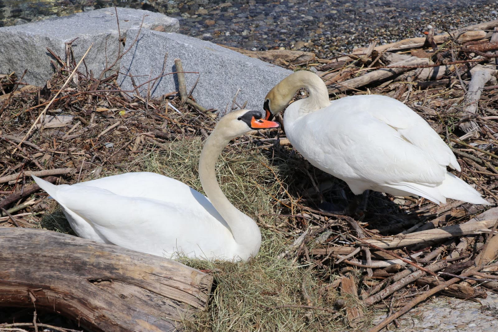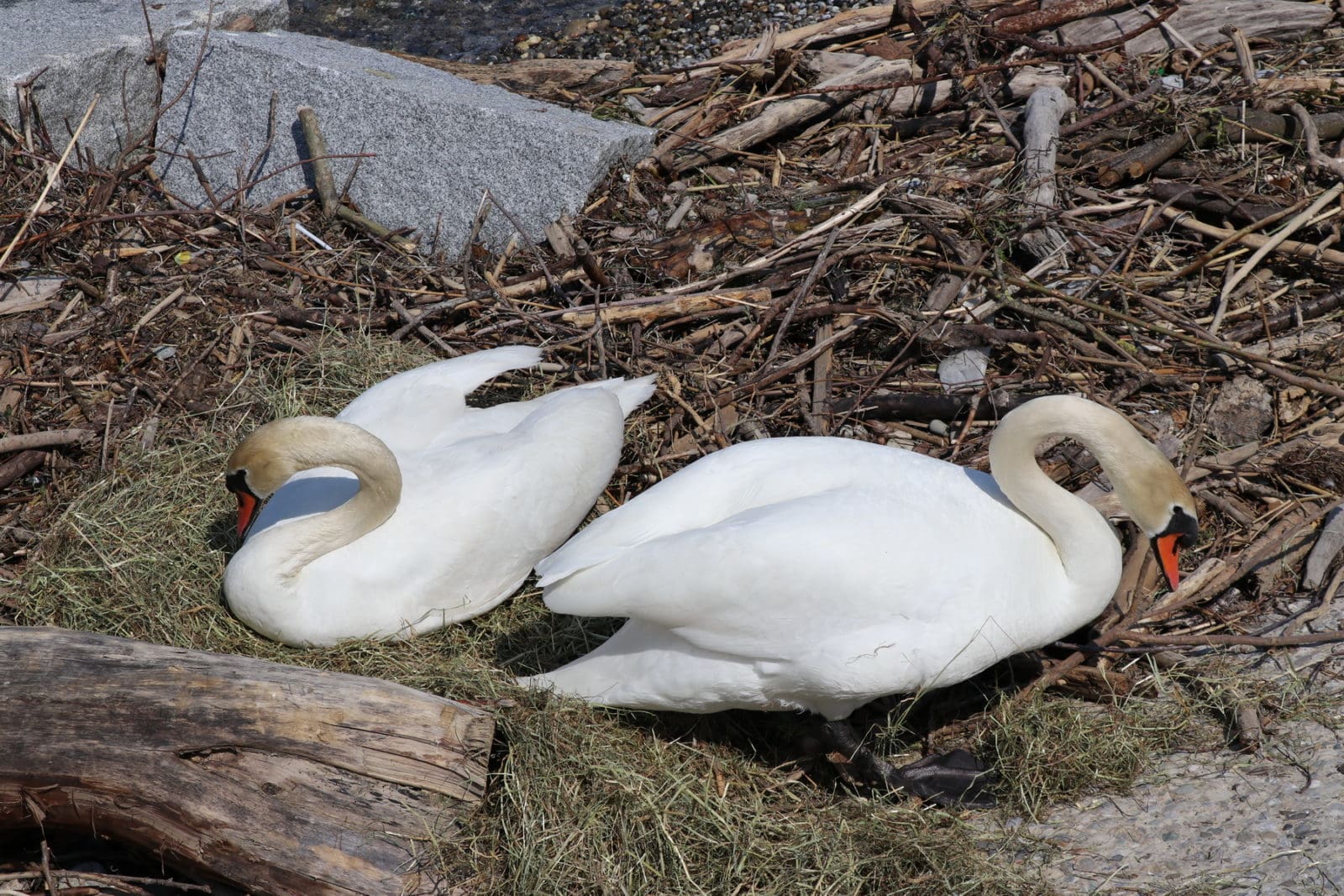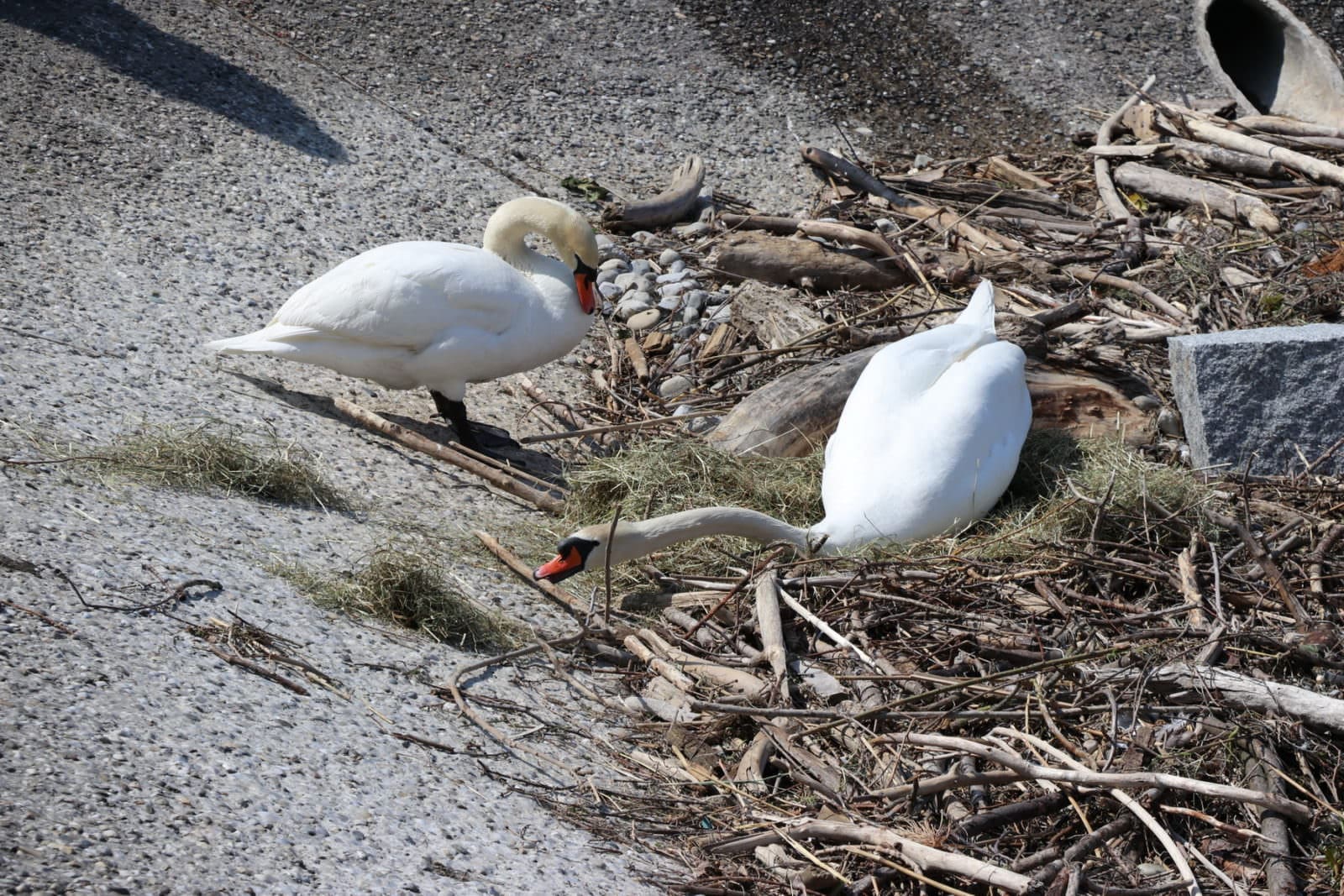 Die Rorschacher Schwäne faszinieren die Massen. Nachdem letzte Woche beim Seerestaurant 2 junge Schwänlein geschlüpft sind, ist bei dieser Familie wenigstens noch eins übrig geblieben. Beim Arionnest tut sich immerhin so viel, dass das Nest jetzt mit Stroh ausgelegt wird. Vielleicht ein Zeichen, dass da das Schlüpfen demnächst der Fall sein wird. Die hier gezeigten Bilder wurden um 15 Uhr aufgenommen.