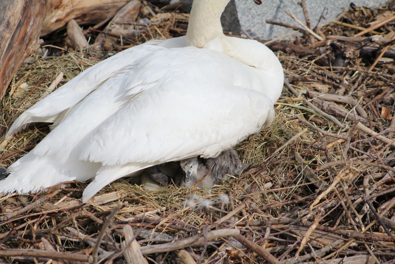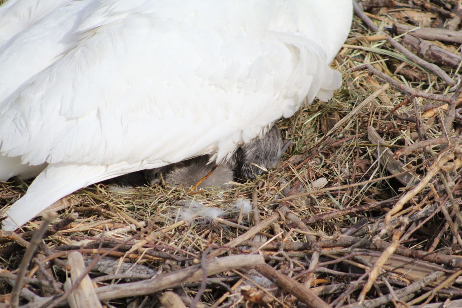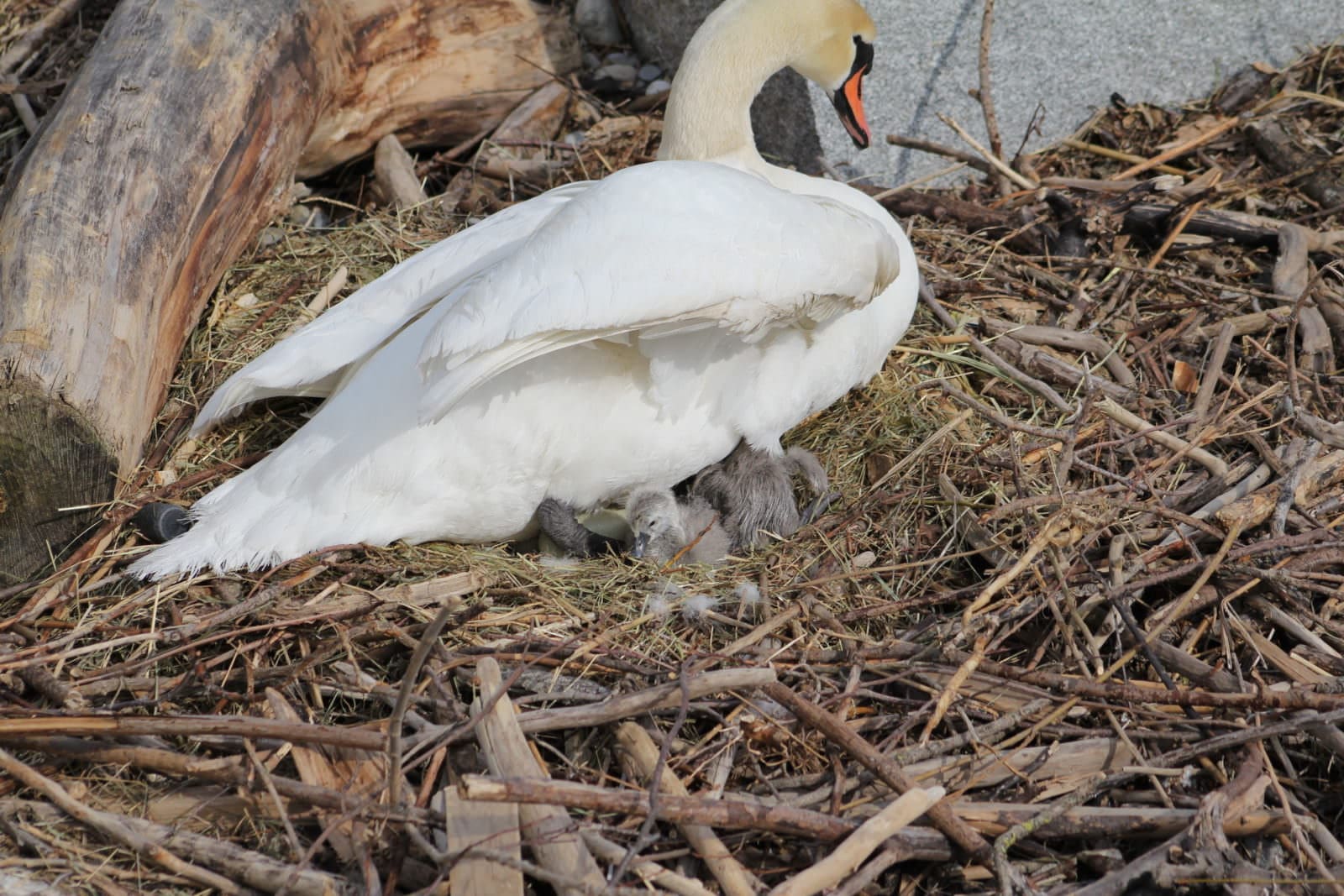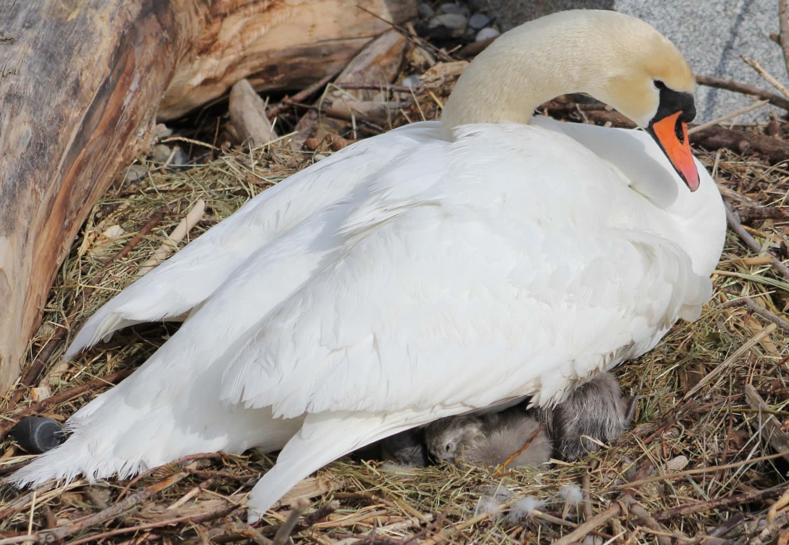 Die Nachricht hat sich in Windeseile im Städtchen verbreitet: Das Schlüpfen der jungen Schwänlein im Arionnest hat heute Morgen eingesetzt. Hier Bilder, die um ca. 10.30 Uhr aufgenommen wurden. Man erkennt nicht noch nicht genau, wie viele Junge sich unter den Flügeln von Mamaschwan befinden. Aber was wird sich im Verlauf des Tages schon noch klären. Und Papaschwan bewacht das Territorium und geht auf alles los, was sich da auch nur ansatzmässig nähern will.
