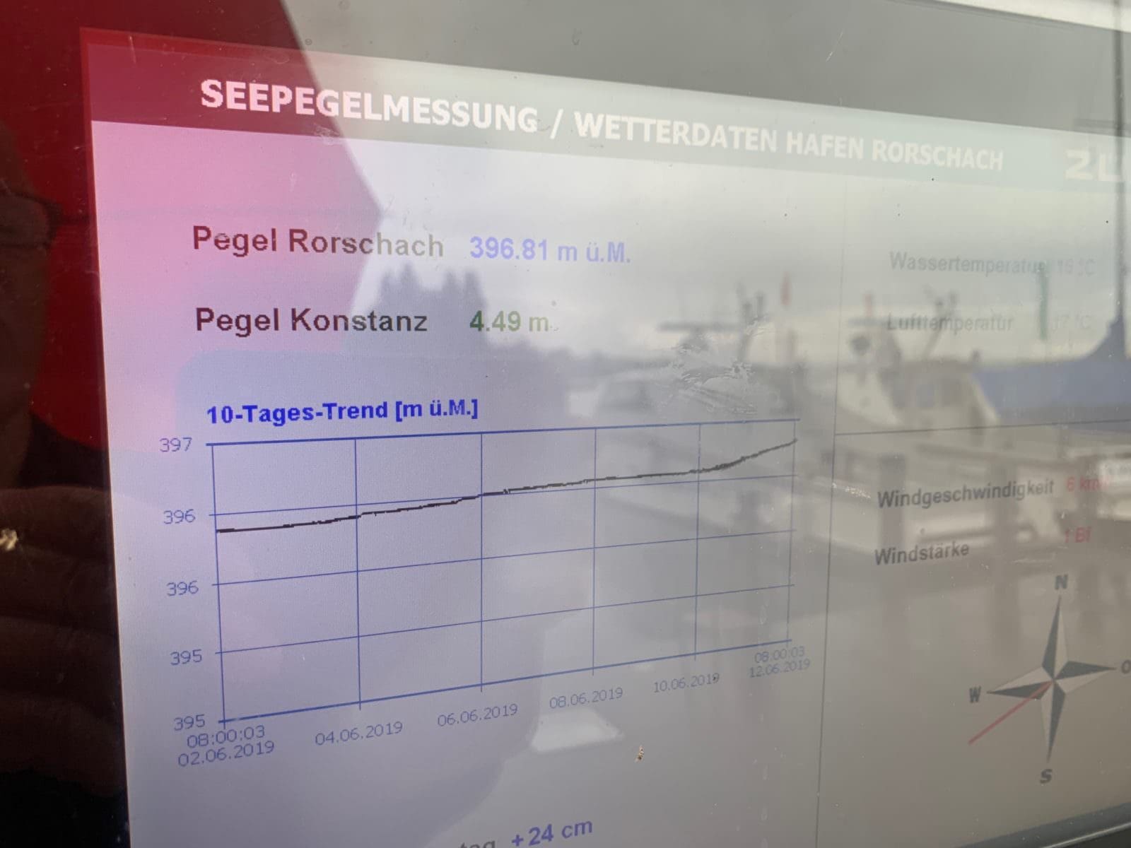 Nachdem bis Messstation beim Rorschacher Kornhaus gestern noch einen Wasserstand von 396.73 anzeigte, waren es heute morgen um 08.30 Uhr bereits 396.81. Der nächste Kontrollgang findet am Nachmittag statt. Das Rorschacher Echo wird das im Auge behalten. Die kritische Marke für Rorschach liegt bei 397.10.