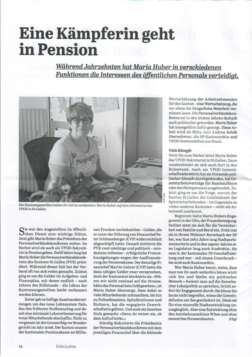 Die kennen wir doch …Themen:Rorschach 13. Juni 2019 - 05:05Maria Huber geht in Pension. Ihre Verdienste werden im „Links“ auf Seite 14 gewürdigt.Teilen mit: Einen Link per E-Mail an einen Freund senden (Wird in neuem Fenster geöffnet) E-Mail Drucken (Wird in neuem Fenster geöffnet) Drucken Auf Facebook teilen (Wird in neuem Fenster geöffnet) Facebook Auf X teilen (Wird in neuem Fenster geöffnet) X Auf WhatsApp teilen (Wird in neuem Fenster geöffnet) WhatsApp Gefällt mir:Gefällt mir Wird geladen …Newsletter abonnieren Bitte dieses Feld leer lassenBitte wähle, ob Du über jeden neuen Beitrag sofort oder lieber jeden Morgen gegen 9 Uhr eine Zusammenfassung der neusten Beiträge erhalten möchtest.Liste(n) auswählen: Neues vom Echo (Zusammenfassung) Neues vom Echo (Sofortbenachrichtigung) Dieses Feld wird benötigt.Prüfen Sie Ihren Posteingang und den Spamordner, um Ihr Abonnement zu bestätigen.