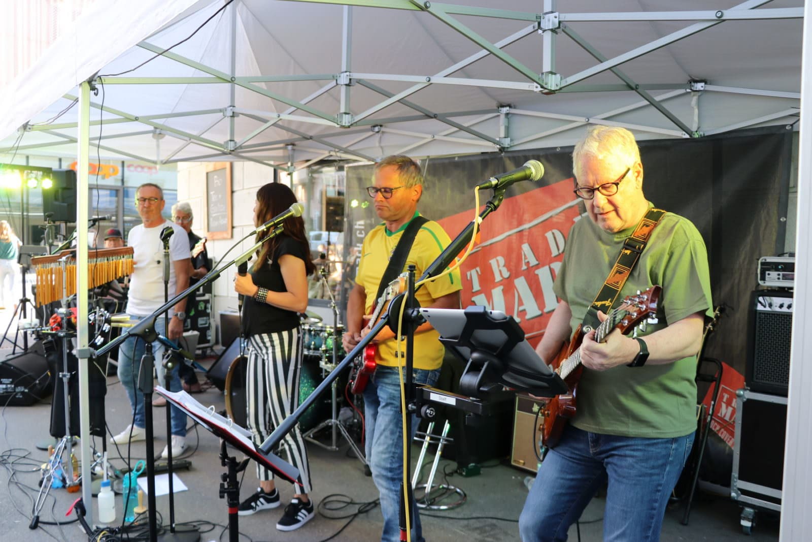 Trade Mark durften gestern Abend bereits zum 4. Mal in der Reihe „Musig am Marktplatz“ auftreten. Die Gigs vor der Münzhofbar gehören mittlerweile zu einer der liebsten Location der Band. Dafür gibts viele gute Gründe: Ein toller Gastgeber, ein ebenso tolles und uns wohlgesinntes Publikum, die Nähe von Band und Publikum könnte kaum enger sein, coole Drinks und einfach eine schöne und unkomplizierte Atmosphäre. Das war gestern einmal mehr nicht anders und für die Sängerin Andrea als Rorschacherin war das ein besonderes Heimspiel. Hier einige Schnappschüsse von gestern.