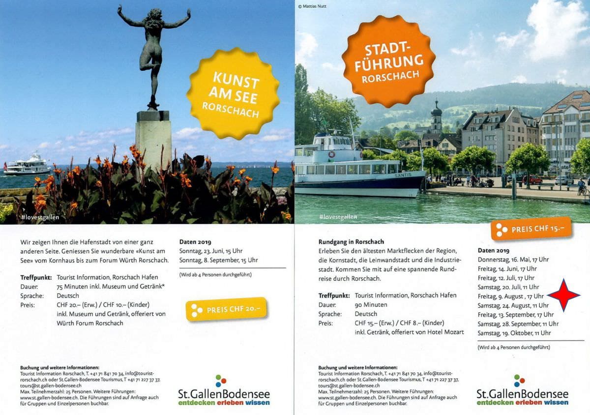 Heute wird wieder eine Stadtführung angebotenThemen:KulturRorschach 9. August 2019 - 05:05Start ist um 17 Uhr bei der Tourist Information am Rorschacher Hafen. Dauer gut eineinhalb Stunden. Kosten pro Person Fr. 15.00 (Kinder Fr. 8.00).Teilen mit: Einen Link per E-Mail an einen Freund senden (Wird in neuem Fenster geöffnet) E-Mail Drucken (Wird in neuem Fenster geöffnet) Drucken Auf Facebook teilen (Wird in neuem Fenster geöffnet) Facebook Auf X teilen (Wird in neuem Fenster geöffnet) X Auf WhatsApp teilen (Wird in neuem Fenster geöffnet) WhatsApp Gefällt mir:Gefällt mir Wird geladen …Newsletter abonnieren Bitte dieses Feld leer lassenBitte wähle, ob Du über jeden neuen Beitrag sofort oder lieber jeden Morgen gegen 9 Uhr eine Zusammenfassung der neusten Beiträge erhalten möchtest.Liste(n) auswählen: Neues vom Echo (Zusammenfassung) Neues vom Echo (Sofortbenachrichtigung) Dieses Feld wird benötigt.Prüfen Sie Ihren Posteingang und den Spamordner, um Ihr Abonnement zu bestätigen.