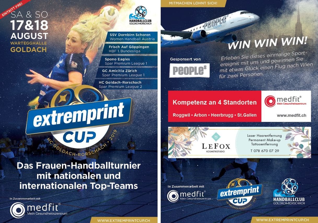 Der Handballclub Goldach-Rorschach veranstaltet am 17./18. August bereits zum zweiten Mal ein hochkarätig besetztes Frauen-Handballturnier. Der Einladung des hiesigen SPLII-Fanionteams sind namhafte Teams der höchsten Ligen aus Deutschland, Österreich und der Schweiz gefolgt. Bundesligist Frisch Auf Göppingen, der SSV Dornbirn Schoren, die Spono Eagles, GC Amicitia Zürich sowie der HC GoRo werden beim extremprint Cup 2019 in der Wartegghalle Goldach um den Sieg kämpfen. Hochspannung und attraktiver Handballsport auf höchstem Niveau sind garantiert. Mehr Infos zum Turnier findet man hier.