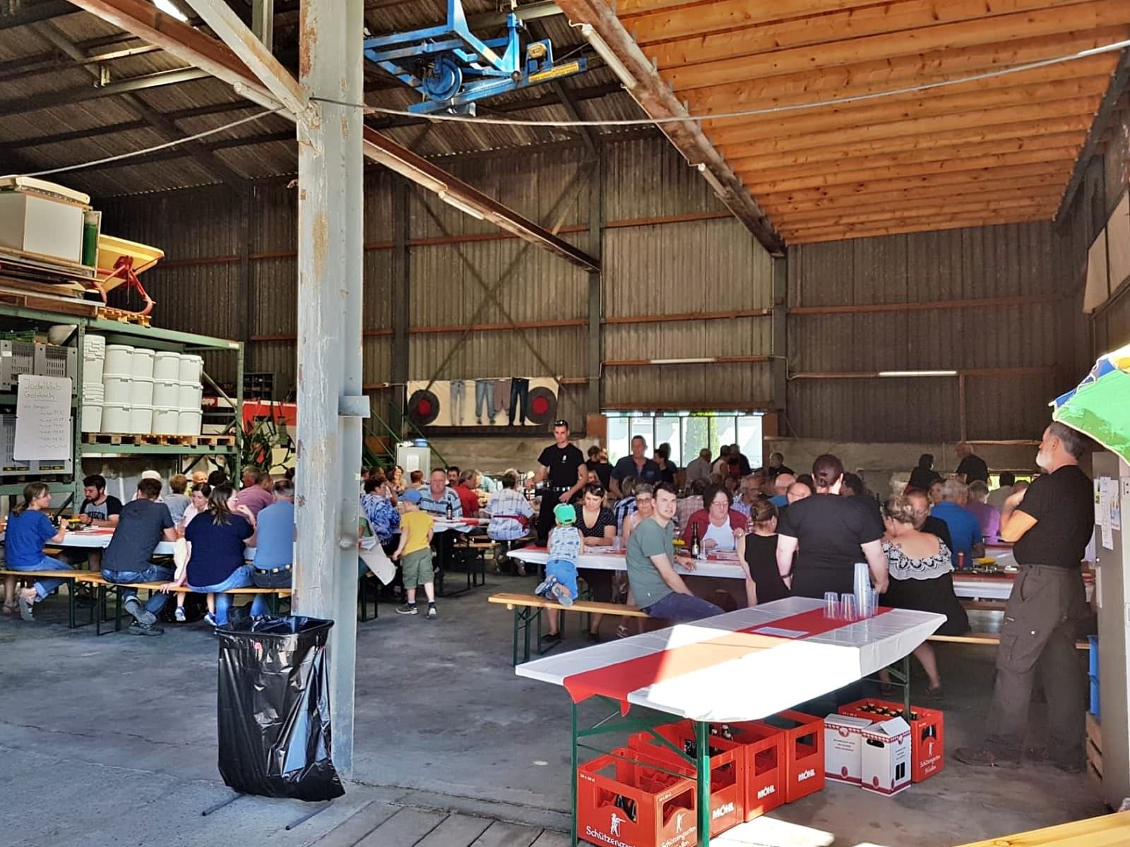 Der kürzlich zum 2. Mal durchgeführte Spaghetti Plausch à Discrétion war wieder ein voller Erfolg. Bei schönstem Sommerwetter trafen ab 11:00 Uhr gegen die 100 Personen mit dem Auto, dem E-Bike oder zu Fuss auf dem Hof von S. und C. Germann in Goldach ein. Die Scheune wurde zuvor von den Mitgliedern des Jodelklub Goldach gemütlich und einladend eingerichtet. Die Besucher erwartete am Buffet eine Auswahl von gleich vier verschiedenen Spaghetti-Angeboten. So konnten alle wählen zwischen Bolognese, Carbonara, Napolitana oder Al Pesto Sauce oder gleich alle vier Sorten probieren. Neu wurden die Getränke am Tisch serviert, was etwas mehr Ruhe in den Betriebsablauf brachte und von den Gästen sehr geschätzt wurde. Zum Nachtisch stand ein reichhaltiges Kuchen- und Torten Buffet parat. Im Abstand von jeweils ca. 45 Min. unterhielt der Jodelklub die Gäste mit Jodelliedern und Zäuerli. Dann hiess es wieder: Ab an die Arbeit zum Spaghetti kochen, Saucen wärmen, Geschirr Abräumen und Abwaschen. So ging die Zeit im Flug vorbei und Besucher sowie die Mitglieder des Jodelklub Goldach durften am späten Nachmittag auf einen gelungenen Anlass zurückblicken.