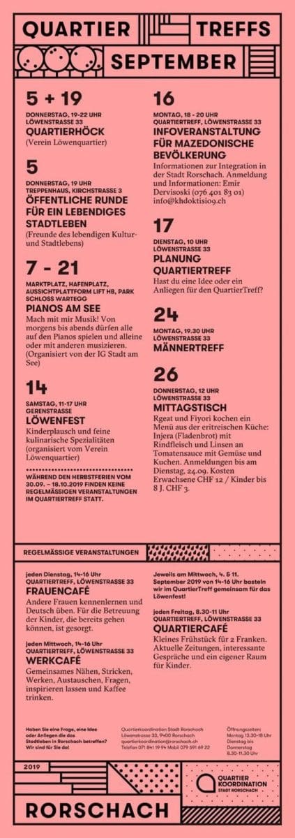 Während die neuen Angebote laufen bleibt es bunt im und um den QuartierTreff. Neben den Pianos am See, dem traditionellen Löwenfest und einer Informationsveranstaltung für die mazedonische Bevölkerung findet auch ein Mittagstisch statt. Am 26. September 2019 kocht Rgeat und Fiyori aus Eritrea: Injera (Fladenbrot) mit Rindfleisch und Linsen an Tomatensauce mit Gemüse und Kuchen.