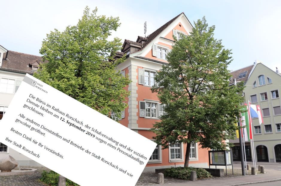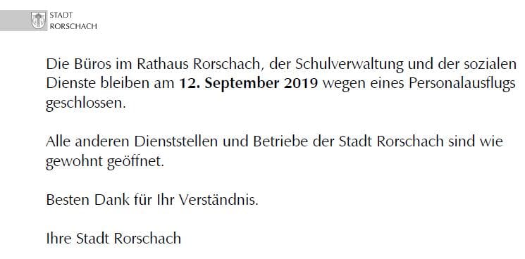 Am kommenden Donnerstag, 12. September 2019, bleiben die Büros im Rathaus, der Schulverwaltung und der sozialen Dienste wegen eines Personalausflugs geschlossen. Alle andere Dienststellen und Betriebe der Stadt Rorschach bleiben wie gewohnt geöffnet.