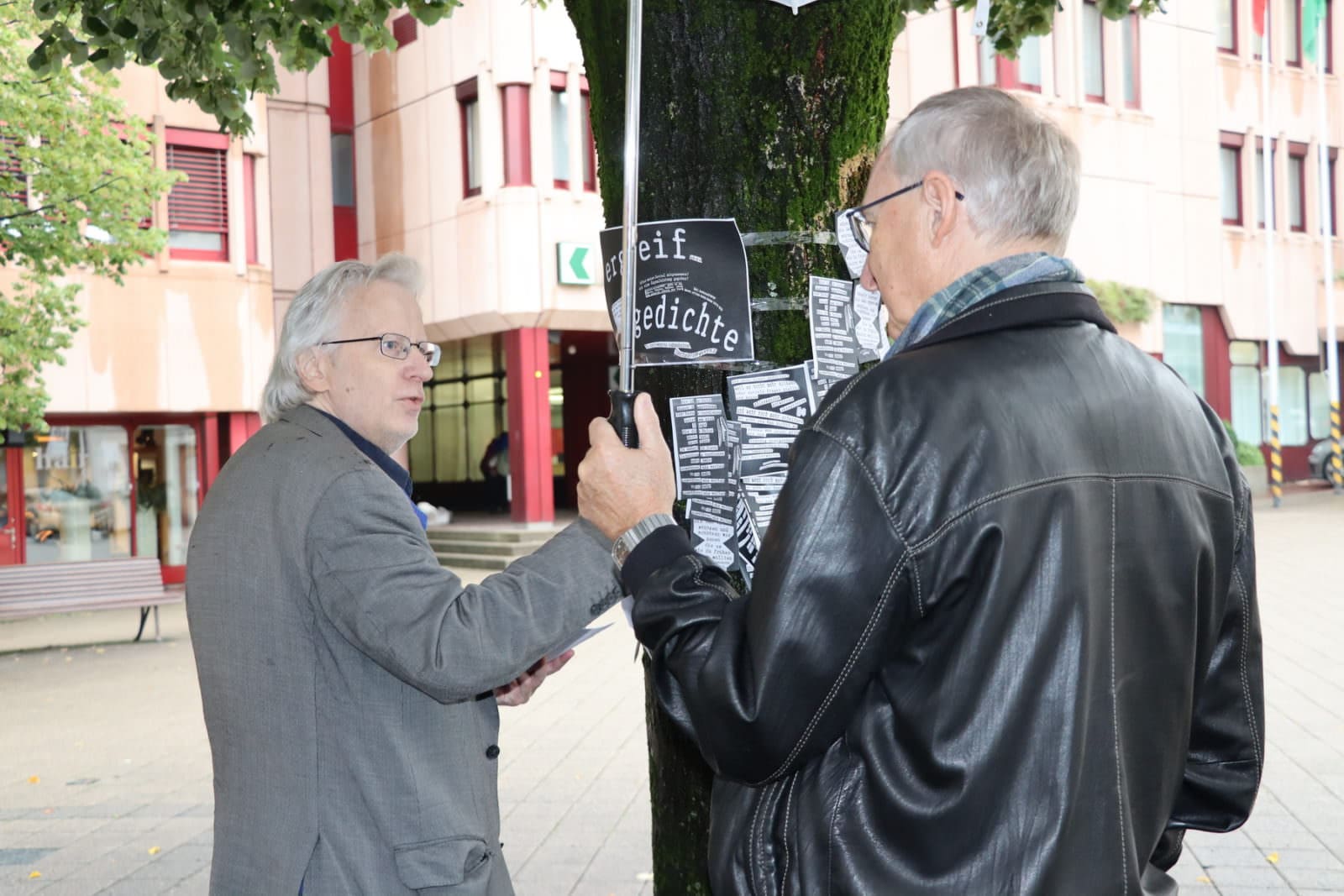 Noch nie hat man bei einem Vortrag eines Künstlers die Person und die Kunst und was dahinter steckt, intensiver erfahren als in der Lesestunde im Mozart. Die Anekdoten, noch mehr als die Texte selber, zeichneten ein Bild von ihm, das nachhaltig auf die Zuhörer wirkte. Nach diesem Abend kennen ihn zwanzig Personen mehr und alle wünschen von ihm noch viele Texte zum Nachdenken, schliesslich will er noch mindestens weitere 30 Jahre Zettel-Gedichte kleben, wenn es sein muss mit Rollator. (go)