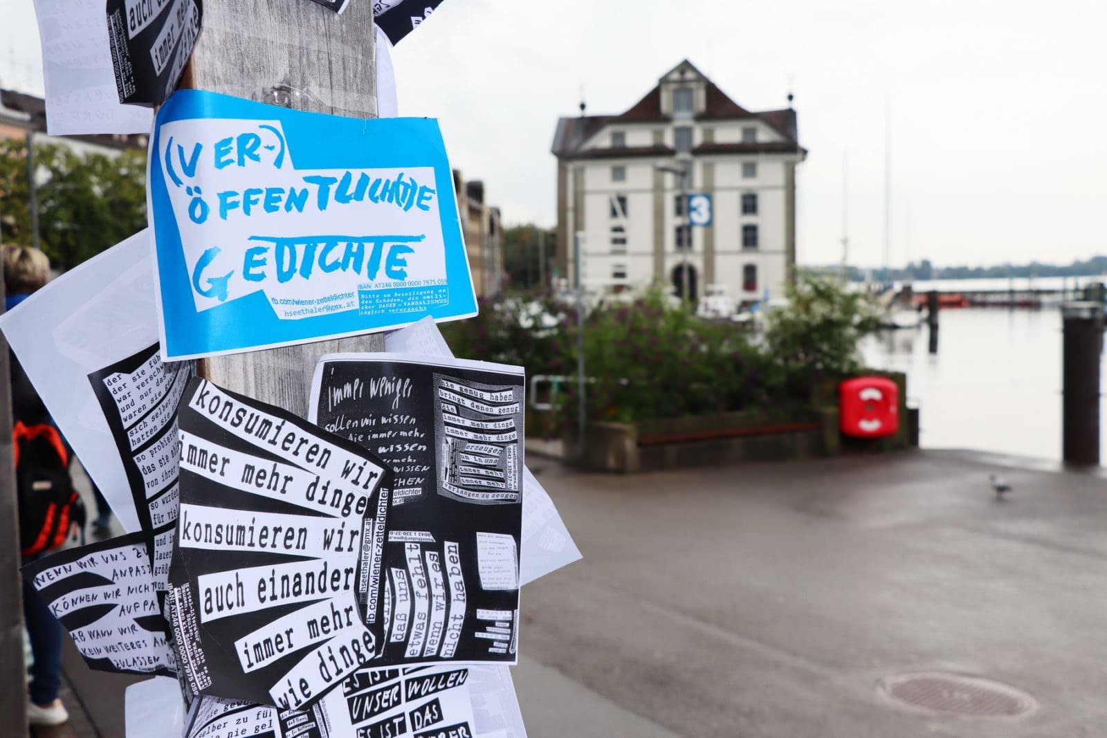 Der Wiener Zetteldichter Helmut Seethaler war am Freitag (im Mozart, Bilder unten) und gestern Samstag (im Strassenbild der Stadt) Gast des Kunstvereins Rorschach.