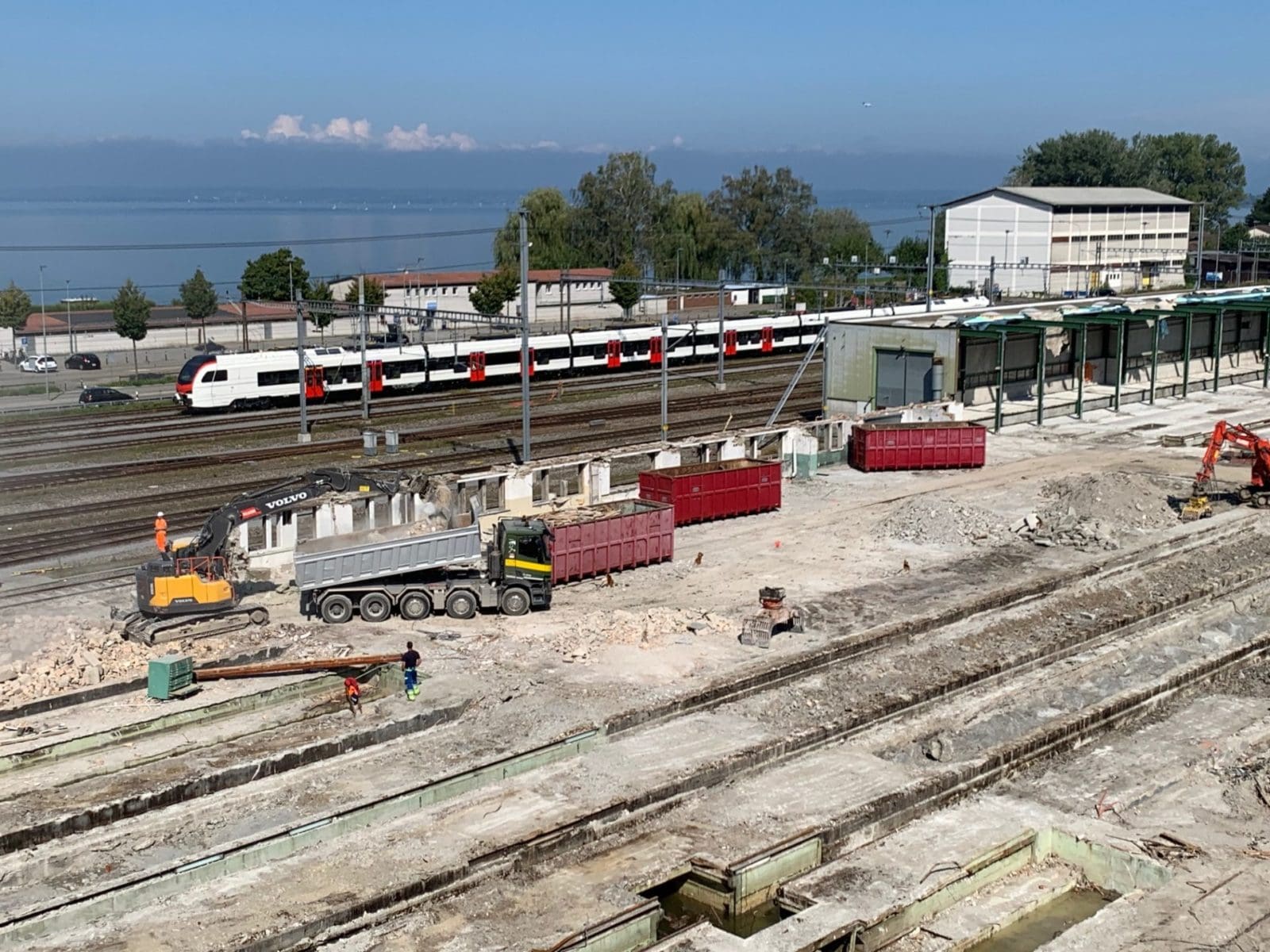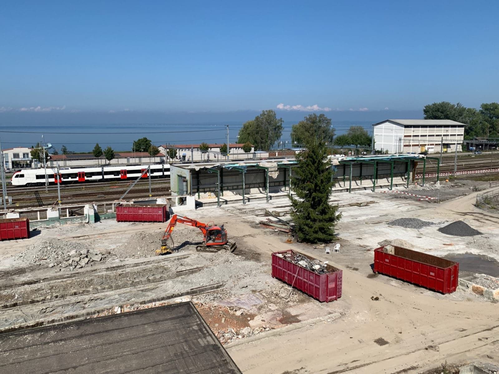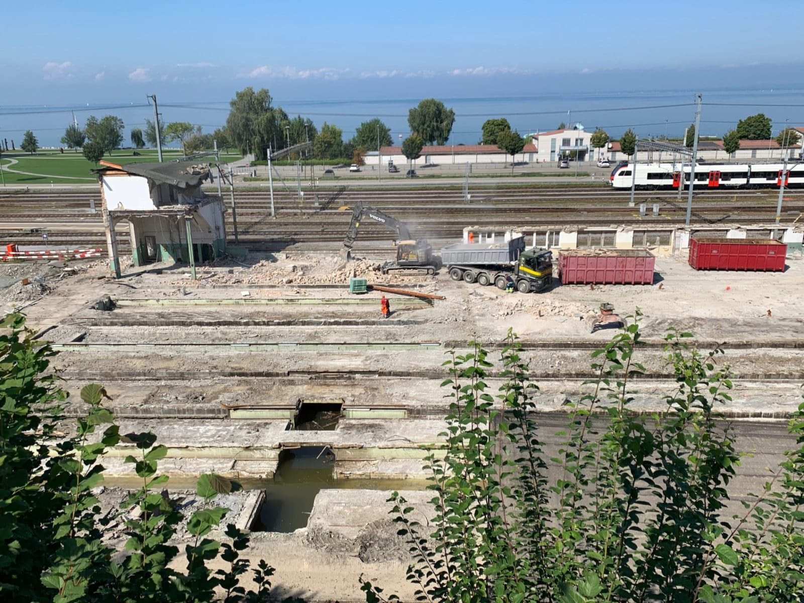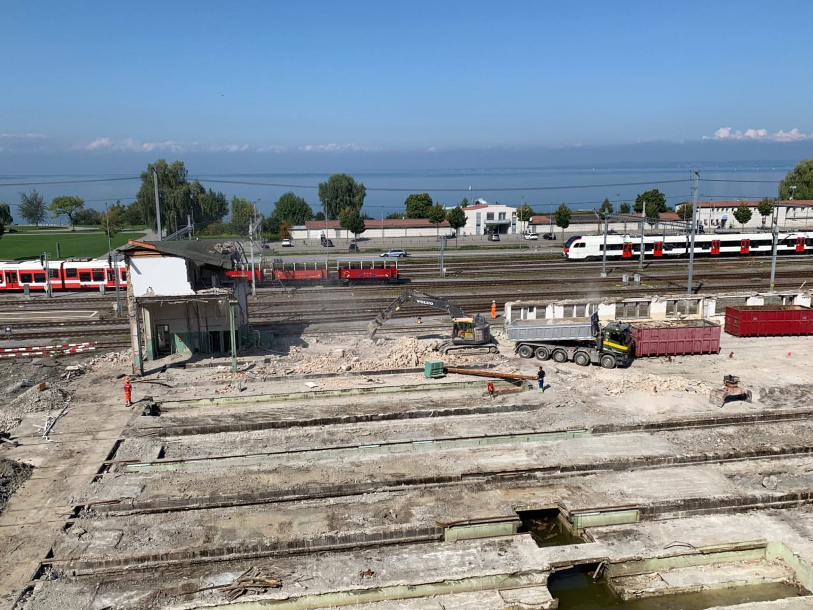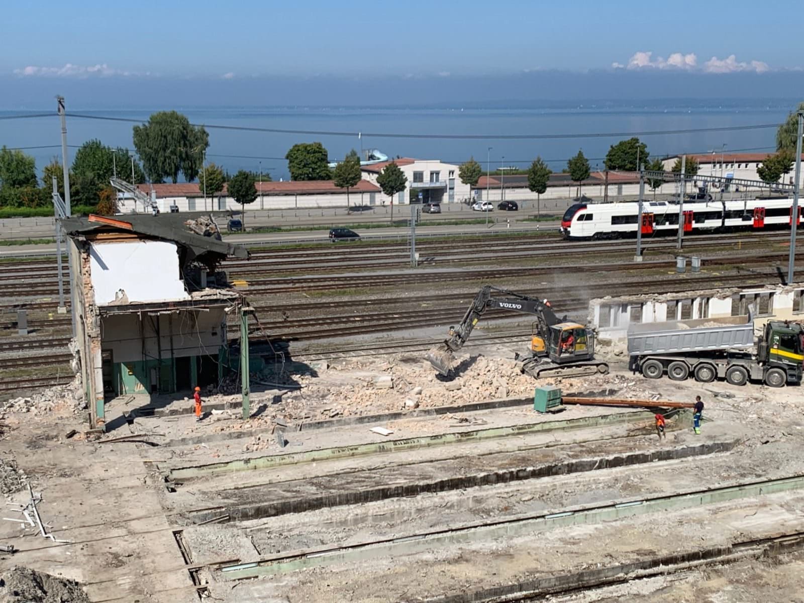 Das Depotgebäude der SBB in Rorschach wird nicht mehr für den Unterhalt von Zügen benötigt und ist baufällig. Eine alternative Nutzung des Gebäudes war aufgrund der Arealerschliessung von Wärme, Elektrizität, Wasser und Abwasser nicht möglich. Aus Sicherheitsgründen hat die SBB entschieden, das Gebäude und die dazu gehörenden Anbauten zurückzubauen. Die Abbrucharbeiten starteten am 23. April 2019 und sind voraussichtlich bis Ende Oktober 2019 abgeschlossen. Die Arbeiten finden tagsüber statt. Der Rückbau kostet rund 1,3 Millionen Franken. Die SBB prüft, für welche Projekte die Landreserve künftig verwendet wird und informiert zu gegebener Zeit erneut. Die hier gezeigten Bilder (oben) stammen von heute Nachmittag.