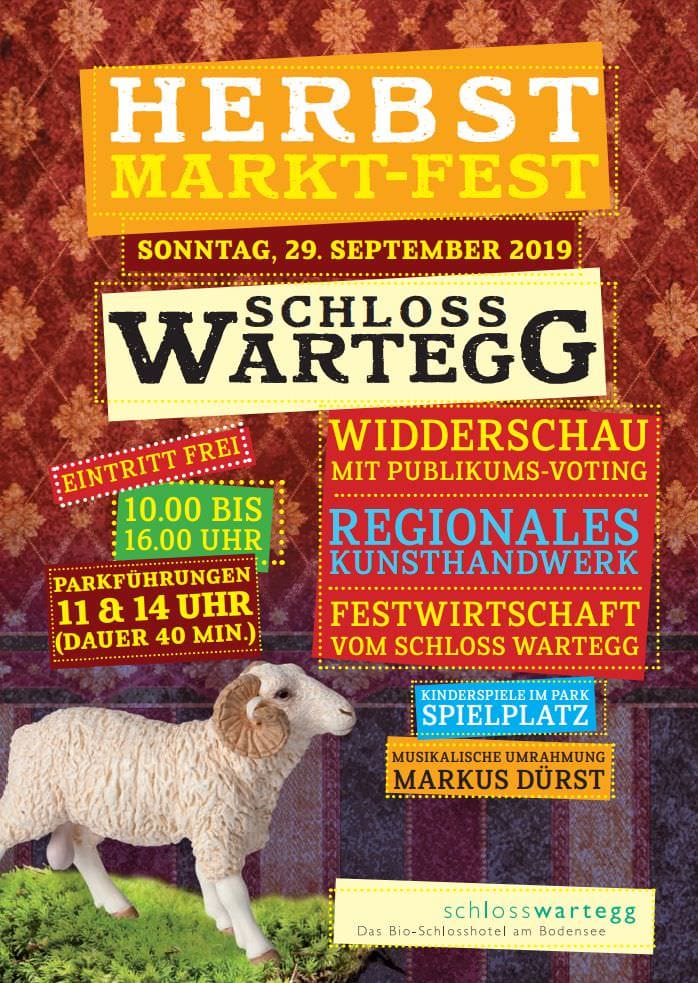 Am kommenden Sonntag, 29. September 2019 besuchen nach 2015 erneut die Widder das Herbstmarkt-Fest auf Schloss Wartegg. Die Bündner Oberländer Widder kommen zurück von der Alp und die Züchter zeigen stolz ihre Widder. Das Publikum ist eingeladen, den schönsten Widder zu wählen. Marktstände, Musik, feines Essen und Gartenführungen runden das Angebot für Familien ab.