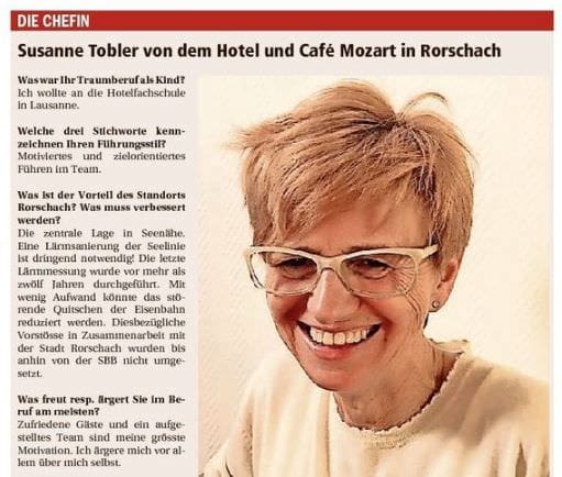 Susanne Tobler vom Mozart in Rorschach wird heute in den Bodensee-Nachrichten porträtiert (Seite 3) und zudem findet man in den BN auf Seite 10 noch eine Bildergalerie mit Aufnahmen von der Theateraufführung „Das magische Rüebli“.