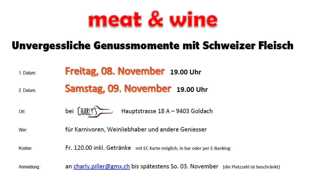 Zusammen saftiges und zartes Fleisch geniessen – ein Geschmackserlebnis der besonderen Art. Fleischgenuss von höchster Qualität mit 8 Wochen gereiftem Kalb- und Rindfleisch. Details findet man auf dem Infoblatt oben. Charly Piller freut ich auf eine Anmeldung bis Sonntag, 03. November unter charly.piller@gmx.ch.