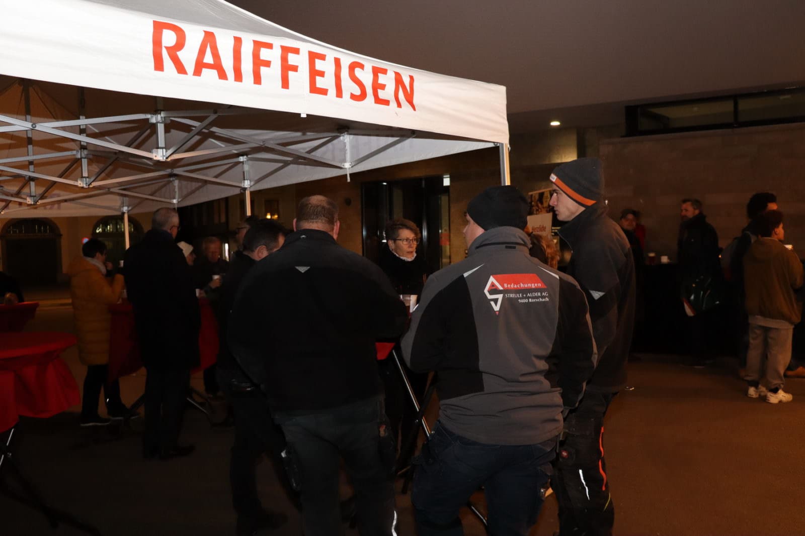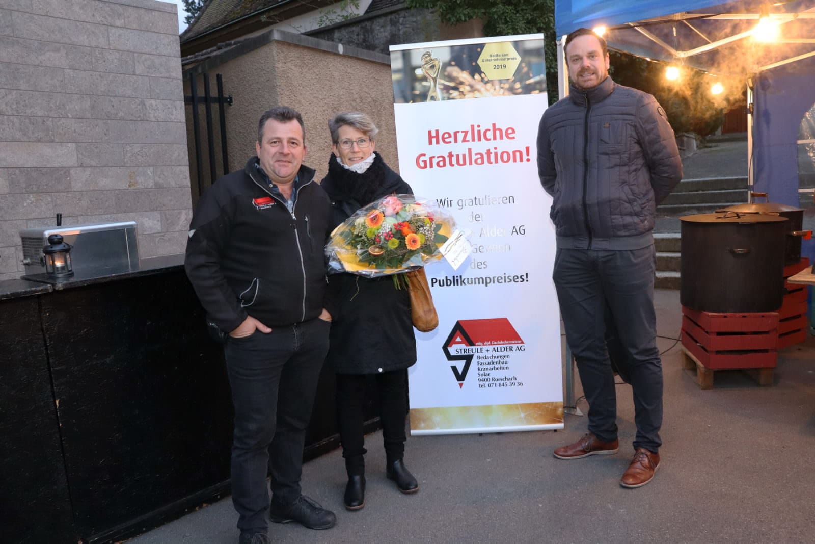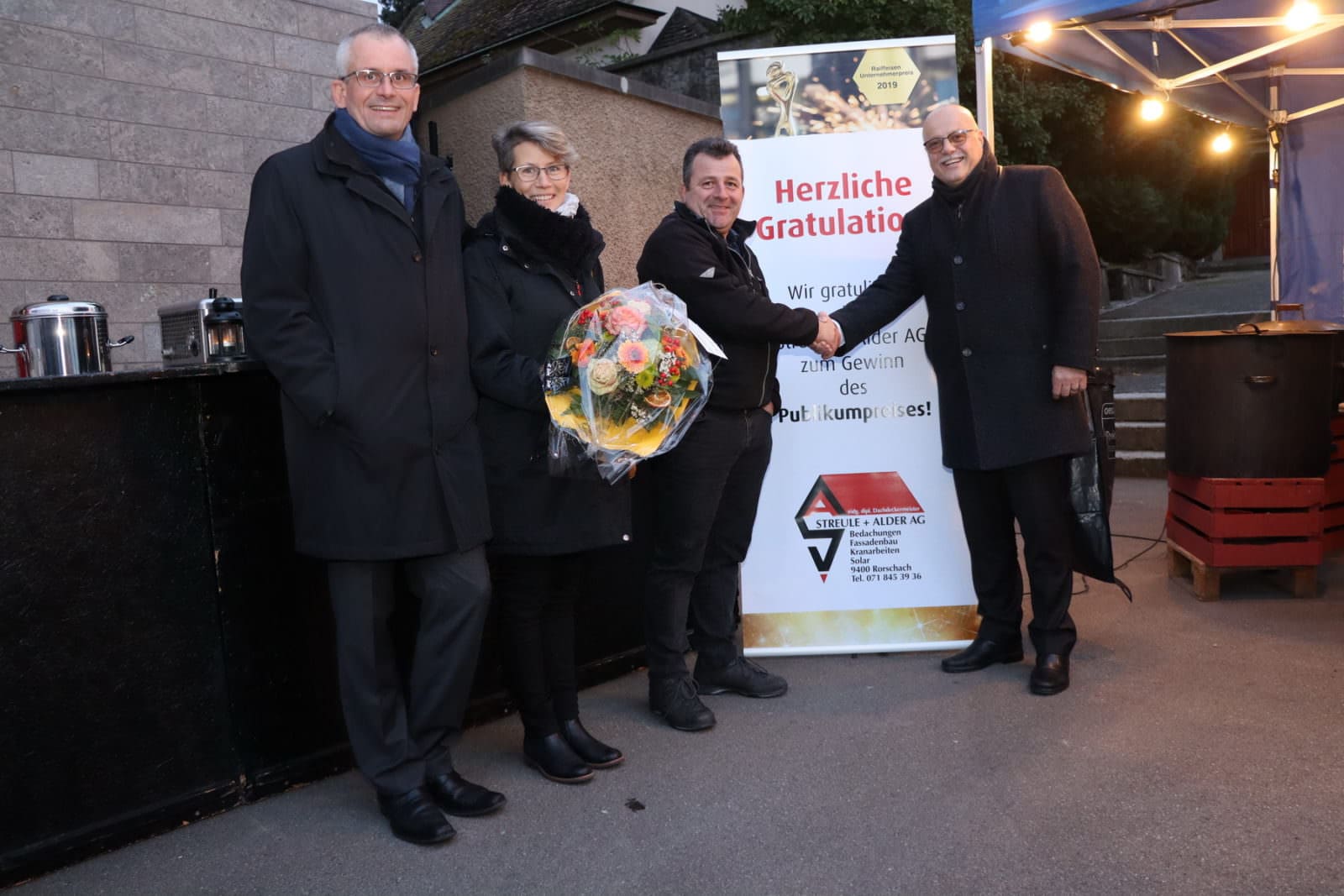 Die Streule + Alder AG hat am letzten Donnerstagabend im Rahmen der Verleihung des Raiffeisen Unternehmerpreises Ostschweiz den Publikumspreis gewonnen. Das Rorschacher Echo hat bereits am Freitag darüber berichtet. Das freute natürlich die InitiantInnen der Raiffeisenbank Region Rorschach, dass die von ihnen nominierte Streule & Alder AG gewonnen hat, und sie haben deshalb gestern spontan die Bevölkerung zu einem kleinen Umtrunk vor die Raiffeisenbank in Rorschach eingeladen. Das Beitragsbild oben zeigt von links Ernst Locher, Vorsitzender der Bankleitung, Eva-Maria und Karl Streule, sowie André Eberhard, Leiter Firmenkundenberatung.