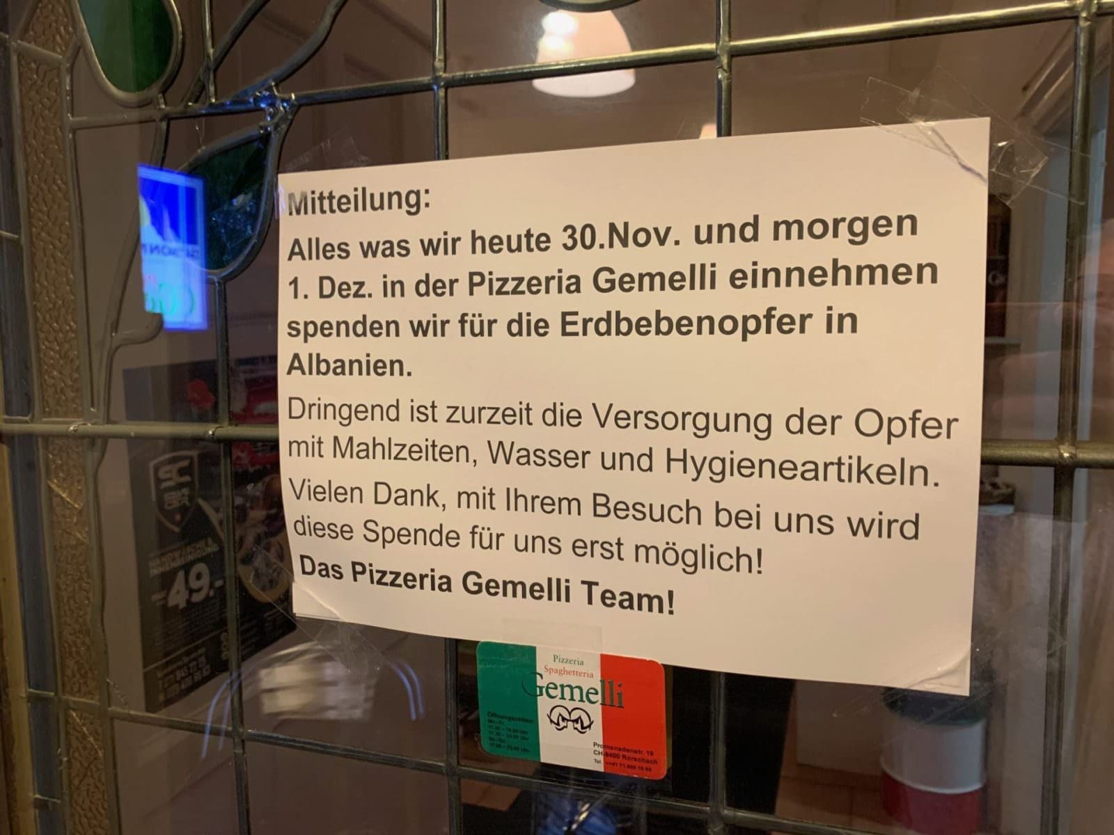 Der Aufruf von Raffaele Gemelli, seinen Umsatz von gestern und heute den Erdbebenopfern in Albanien zu spenden, ist nicht ungehört geblieben. Auch wir haben uns spontan entschieden, diese Aktion zu unterstützen und gestern Abend meldete die Pizzeria Gemelli „voll ausgebucht“. Heute kann man diese Aktion mit einem Besuch ab 17 Uhr unterstützen.