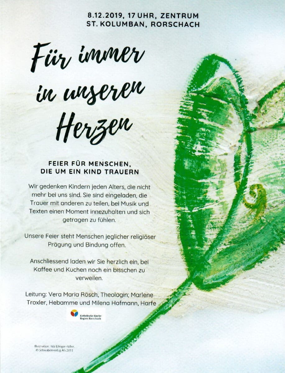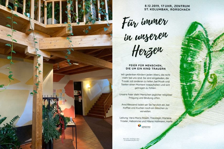 Feier für Menschen, die um ein Kind trauernThemen:Kath. RorschachKulturPartnerRorschach 4. Dezember 2019 - 05:15Das findet am kommenden Sonntag, 8. Dezember 2019, ab 17 Uhr im Zentrum St. Kolumban statt. Mehr Infos findet man auf dem Flyer unten:Teilen mit: Einen Link per E-Mail an einen Freund senden (Wird in neuem Fenster geöffnet) E-Mail Drucken (Wird in neuem Fenster geöffnet) Drucken Auf Facebook teilen (Wird in neuem Fenster geöffnet) Facebook Auf X teilen (Wird in neuem Fenster geöffnet) X Auf WhatsApp teilen (Wird in neuem Fenster geöffnet) WhatsApp Gefällt mir:Gefällt mir Wird geladen …Newsletter abonnieren Bitte dieses Feld leer lassenBitte wähle, ob Du über jeden neuen Beitrag sofort oder lieber jeden Morgen gegen 9 Uhr eine Zusammenfassung der neusten Beiträge erhalten möchtest.Liste(n) auswählen: Neues vom Echo (Zusammenfassung) Neues vom Echo (Sofortbenachrichtigung) Dieses Feld wird benötigt.Prüfen Sie Ihren Posteingang und den Spamordner, um Ihr Abonnement zu bestätigen.