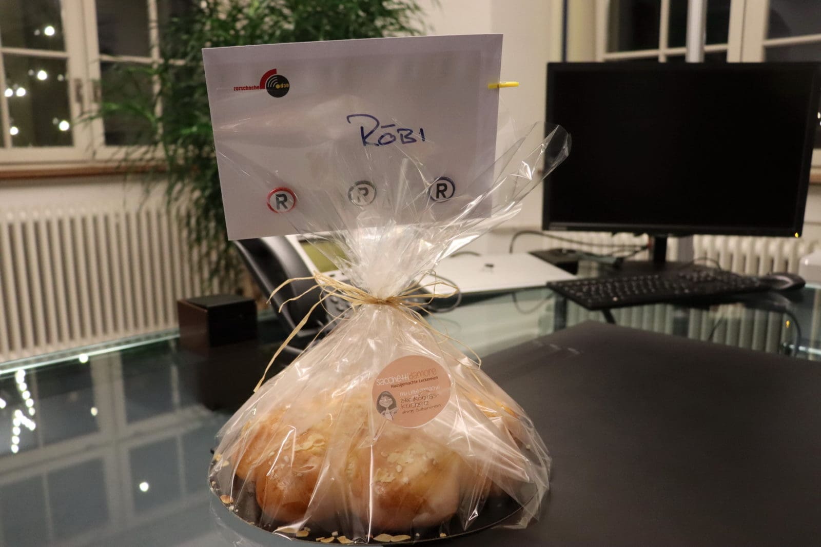 „Und das Rorschacher Echo hat ja sowieso noch was vor heute Morgen. Knacknuss inklusive …“, hiess es im letzten Post zum Arbeitsbeginn von Stapi Röbi Raths. Und da heute der Dreikönigstag ist, kann man Röbi ja gut einen Dreikönigskuchen schenken. In aller Herrgottsfrühe habe ich ihm das auf seinen leeren Pult gestellt. Aber einen König oder eine Königin wird er in diesem Kuchen vergeblich suchen. Diesen Titel muss er sich erst noch verdienen. Aber trotzdem ist beim Reinbeissen Vorsicht angesagt. Sinnbildlich für die vielen Knacknüsse, die Röbi Raths anzugehen hat, wird er in diesem Kuchen – ein Produkt der Rorschacherin Tiziana Sacchetti – eine Knacknuss finden. Und im Couvert natürlich noch einige Tipps und Hinweise …