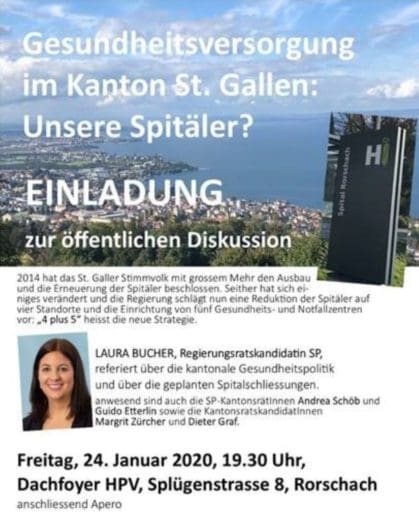 In der Stadt Rorschach wird es noch weitere Veranstaltungen rund um die Wahlen vom 8. März geben: Am kommenden Freitag, 24. Januar 2020, findet ebenfalls im Dachfoyer der HPV an der Splügenstrasse eine von der SP organisierte öffentlichen Diskussion rund um die Gesundheitsversorgung im Kanton St.Gallen statt. Regierungsratskandidatin Laura Bucher referiert über die Gesundheitspolitik und über die geplanten Spitalschliessungen. Details findet man auf dem Flyer unten.