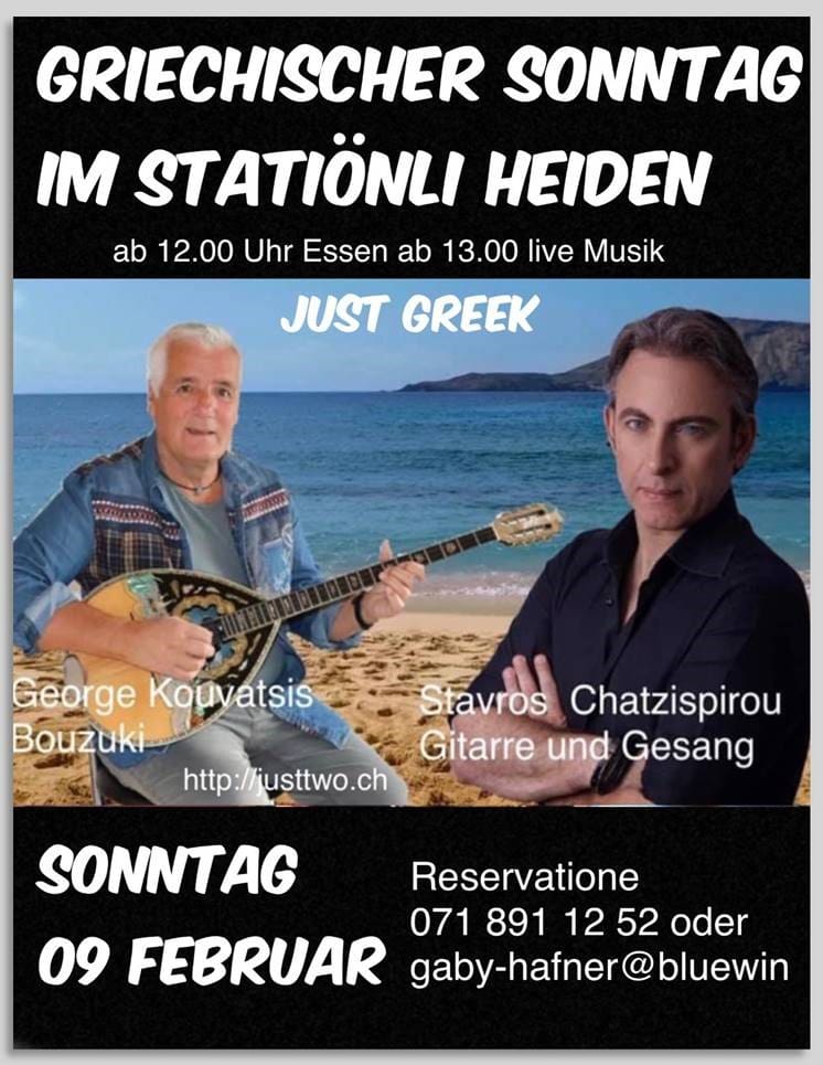 Mit dem Heidener-Bähnli (fast) nach GriechenlandThemen:KulturRegion 6. Februar 2020 - 05:00George und Stavros spielen am kommenden Sonntag (9. Februar) ab 13 Uhr im Statiönli in Heiden. Das Heidener-Bähnli hält unmittelbar vor der Beiz.Teilen mit: Einen Link per E-Mail an einen Freund senden (Wird in neuem Fenster geöffnet) E-Mail Drucken (Wird in neuem Fenster geöffnet) Drucken Auf Facebook teilen (Wird in neuem Fenster geöffnet) Facebook Auf X teilen (Wird in neuem Fenster geöffnet) X Auf WhatsApp teilen (Wird in neuem Fenster geöffnet) WhatsApp Gefällt mir:Gefällt mir Wird geladen …Newsletter abonnieren Bitte dieses Feld leer lassenBitte wähle, ob Du über jeden neuen Beitrag sofort oder lieber jeden Morgen gegen 9 Uhr eine Zusammenfassung der neusten Beiträge erhalten möchtest.Liste(n) auswählen: Neues vom Echo (Zusammenfassung) Neues vom Echo (Sofortbenachrichtigung) Dieses Feld wird benötigt.Prüfen Sie Ihren Posteingang und den Spamordner, um Ihr Abonnement zu bestätigen.