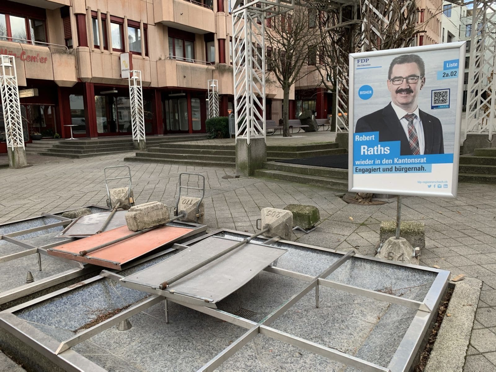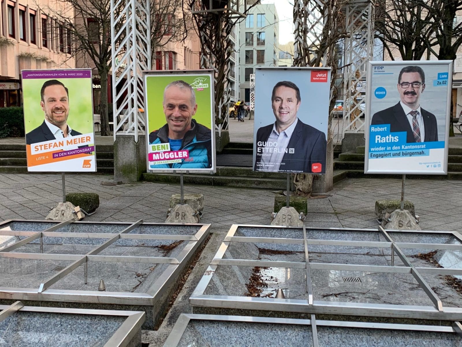 Stürme wie Sabine bringen bei aller Tragik auch diese kleinen ulkigen Geschichten mit sich: Aktuell ist ja bekanntlich Wahlkampf und da erstaunt es auch nicht, dass sich die Kandidaten in bester Pose dem Wahlvolk präsentieren. Auf dem Marktplatz tun dies Stefan Meier, Beni Müggler, Guido Etterlin und Röbi Raths (Bild unten). Gestern Vormittag machte es noch den Anschein, als ob Röbi Raths besondere Standfestigkeit aufzuweisen hat, denn ausser ihm haben die anderen Kandidaten dem Sturm nicht standhalten können. Doch wie das Beitragsbild beweist, hat Sabine dann am Nachmittag auch Röbi noch flach gelegt. Man darf aber davon ausgehen, dass heute im Verlauf des Tages alle vier Kandidaten auf dem Marktplatz wieder um die Wette lächeln …